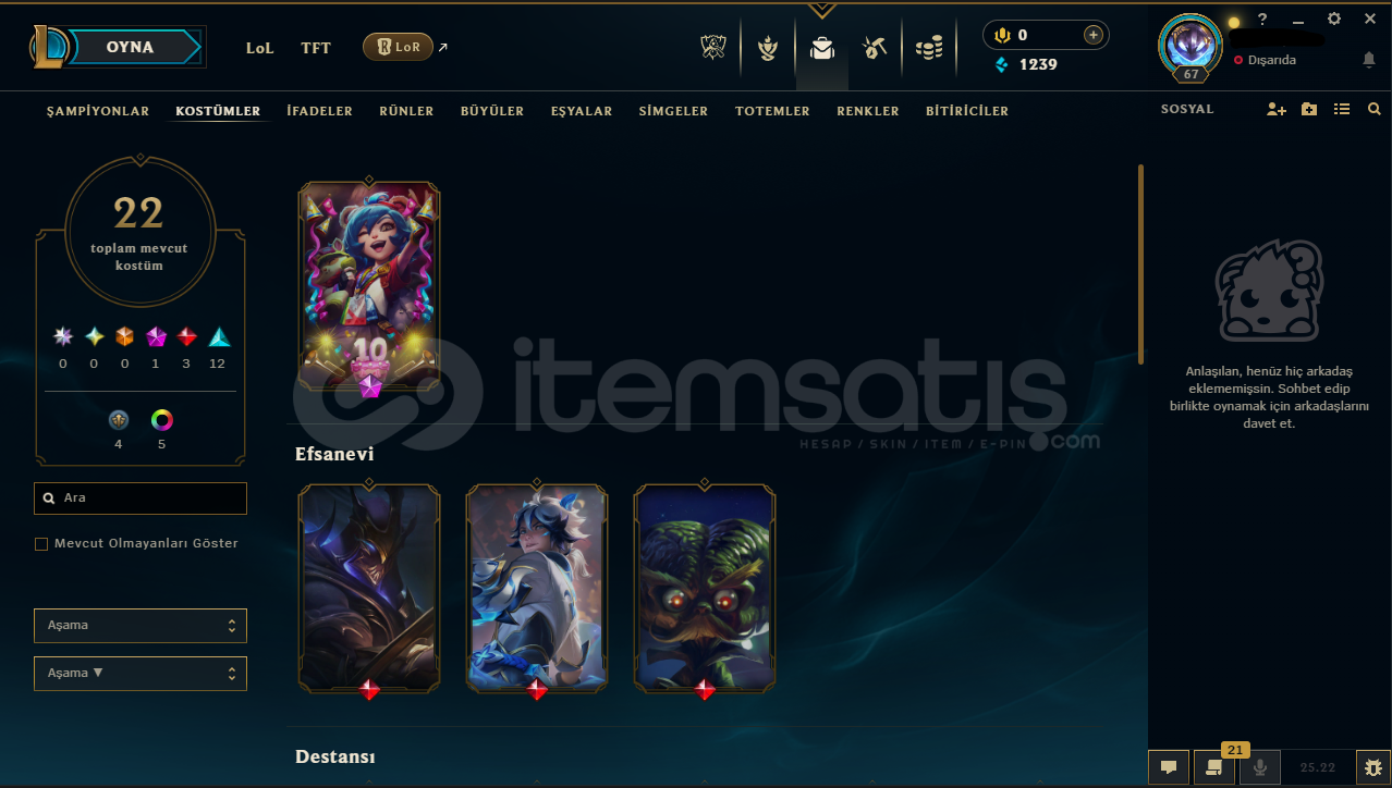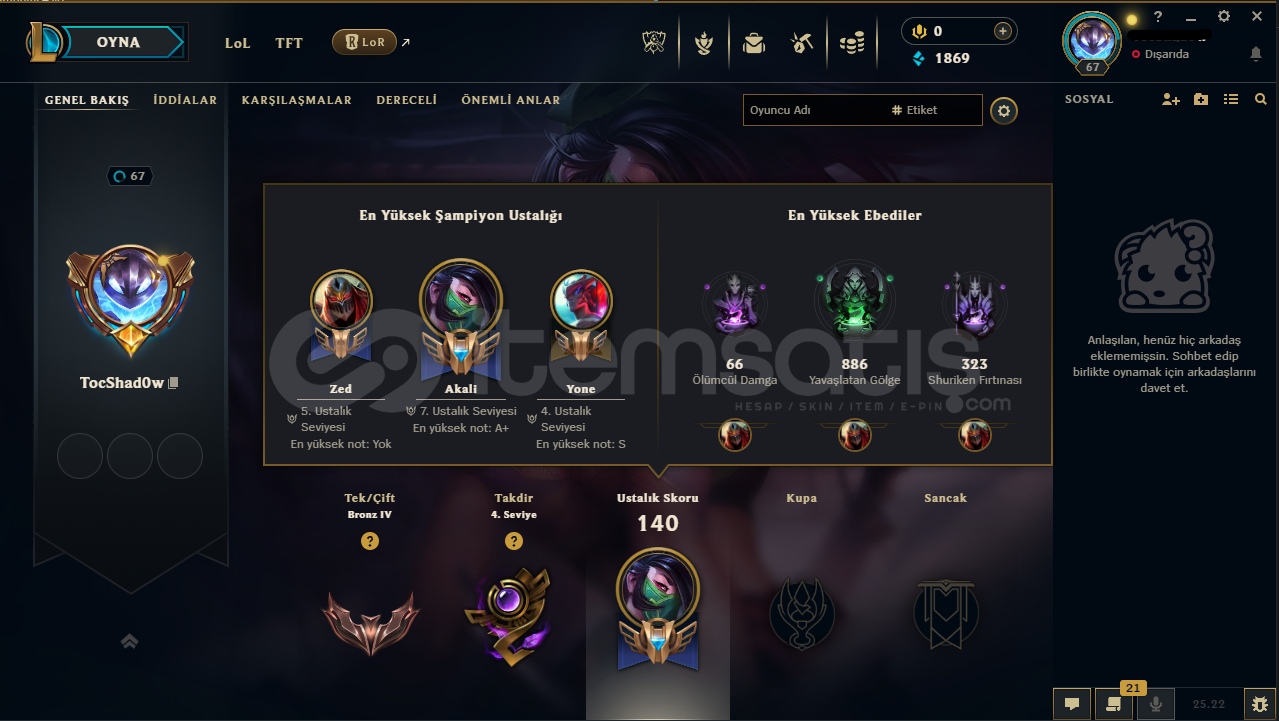 Hesabın E-Posta'sı ve Tüm bilgileri değiştirilebilir.Teslimatlar Otomatik Yapılmaktadır, 7/24 satın alır almaz tüm hesap bilgilerine ulaşabilirsiniz...Dereceli Direkt Girilebilir.1869 Mavi Öz & 1656 Turuncu Öz + 2 Anahtar Bulunmaktadır.Hesabınızı satın aldıktan sonra sizden başka kimsenin erişimi olmaz.67 Level - Bronz 4(EUW) Hesaptır.22 Kostüm ve 63 Şampiyon bul...