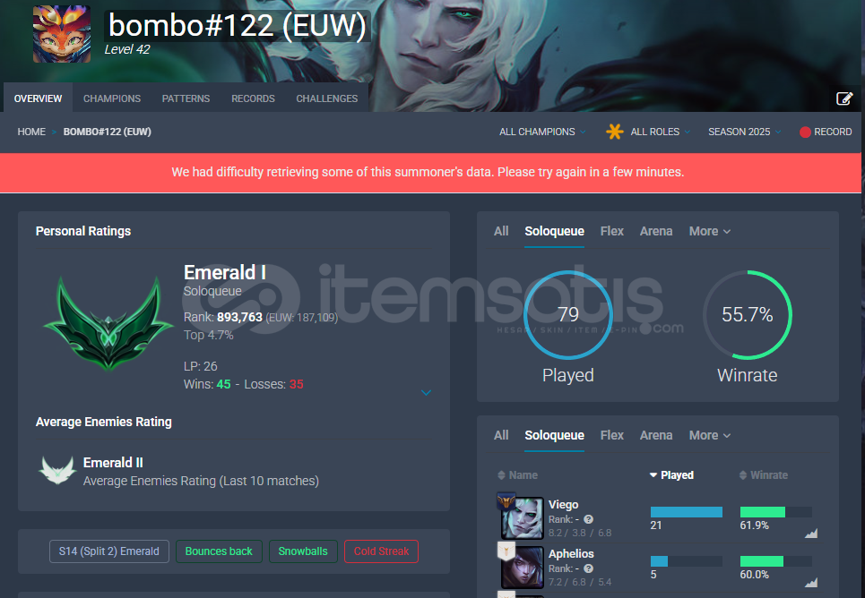 EUW zümrüt 1 55.7 wr nick değişir jg main hesap