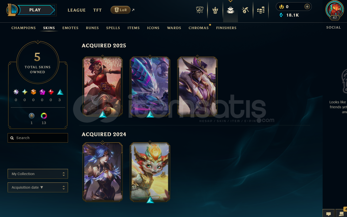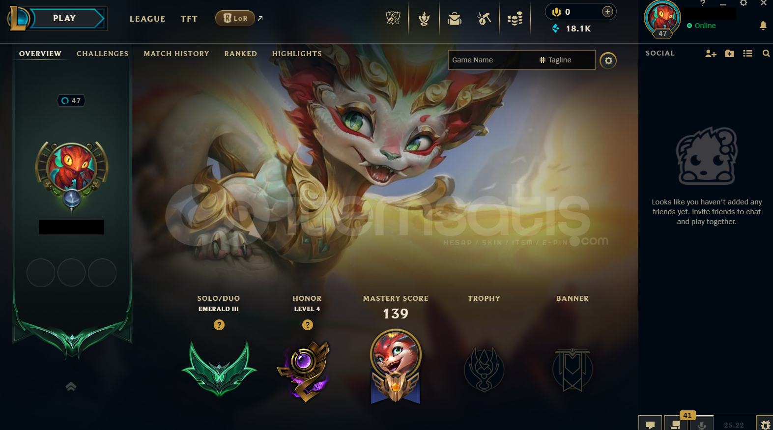 EUW Zümrüt 3 | 5 Kostüm - 18K Mö | LoL Hesap