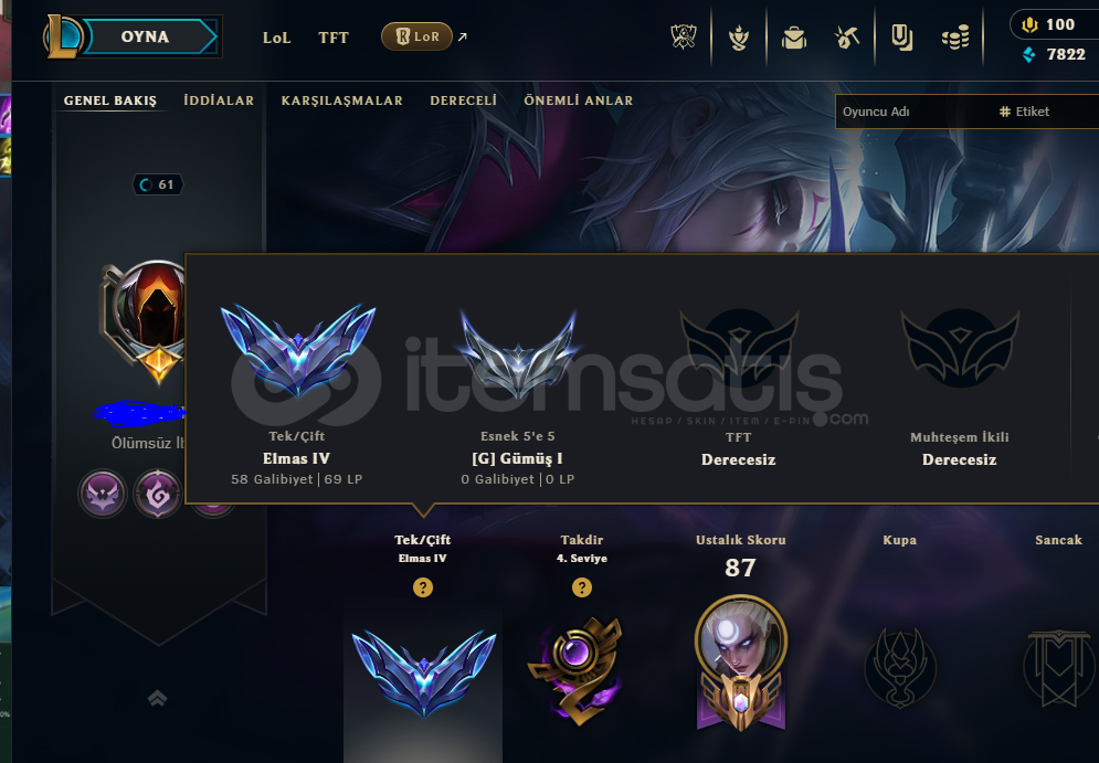 HESAP EUWEST SUNUCUSUNDADIR, CLIENTIM TÜRKÇE OLDUĞU İÇİN SSLER TÜRKÇEDİR.HESAP TEKÇİFT DIAMOND 4 69 LP DİR 52 WINRATEDIRHESAP BOTTEDDAN ASLA BAN YEMEZ 2 YILDIR AKTİF ŞEKİLDE SOLOQ OYNANMAKTADIR.HESAPTA 70 E YAKIN ŞAMPİYON VARDIR TOPLAMDA 14 SKİN VARDIR AMA SKİNLERİN ÇOĞU DEĞERLİ VE NADİRDİR.ASKERLİK GÖREVİMDEN DOLAYI SATIYORUM, ALAN ARKADA#...