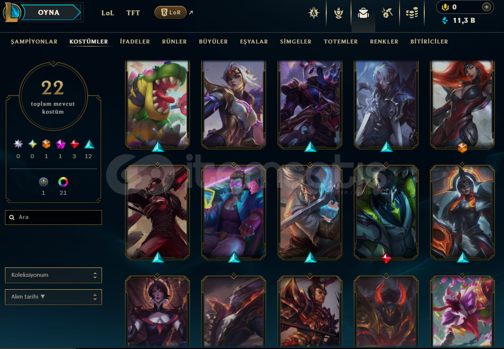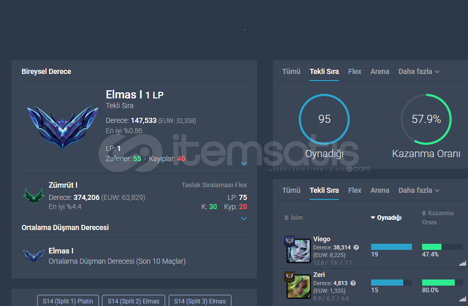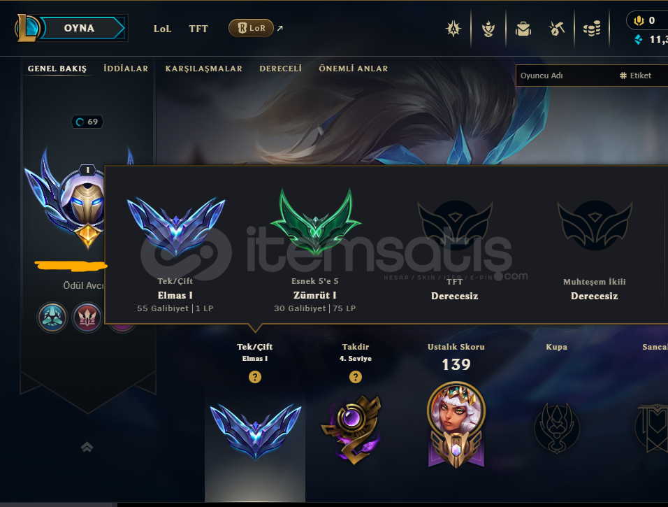 CLİENTİM TÜRKÇE OLDUĞU İÇİN SSLER TÜRKÇEDİR HESAP EUWEST SUNUCUSUNDADIR.HESABIN BOTEDDAN BAN YEME RİSKİ VS. YOKTUR GEÇEN SEZON DERECELİ ÖDÜLLERİNİ ALMIŞTIR 3 SPLİTTİR DİAMOND BİTİRMEKTEDİR.HESABIN LP GAİNİ +22 +23 LP DİR 4 MAÇA MASTERA ÇIKAR %58 WİNRATE I VARDIRHESAPTA AZ AMA DEĞERLİ GÜZEL SKİNLER BULUNMAKT...