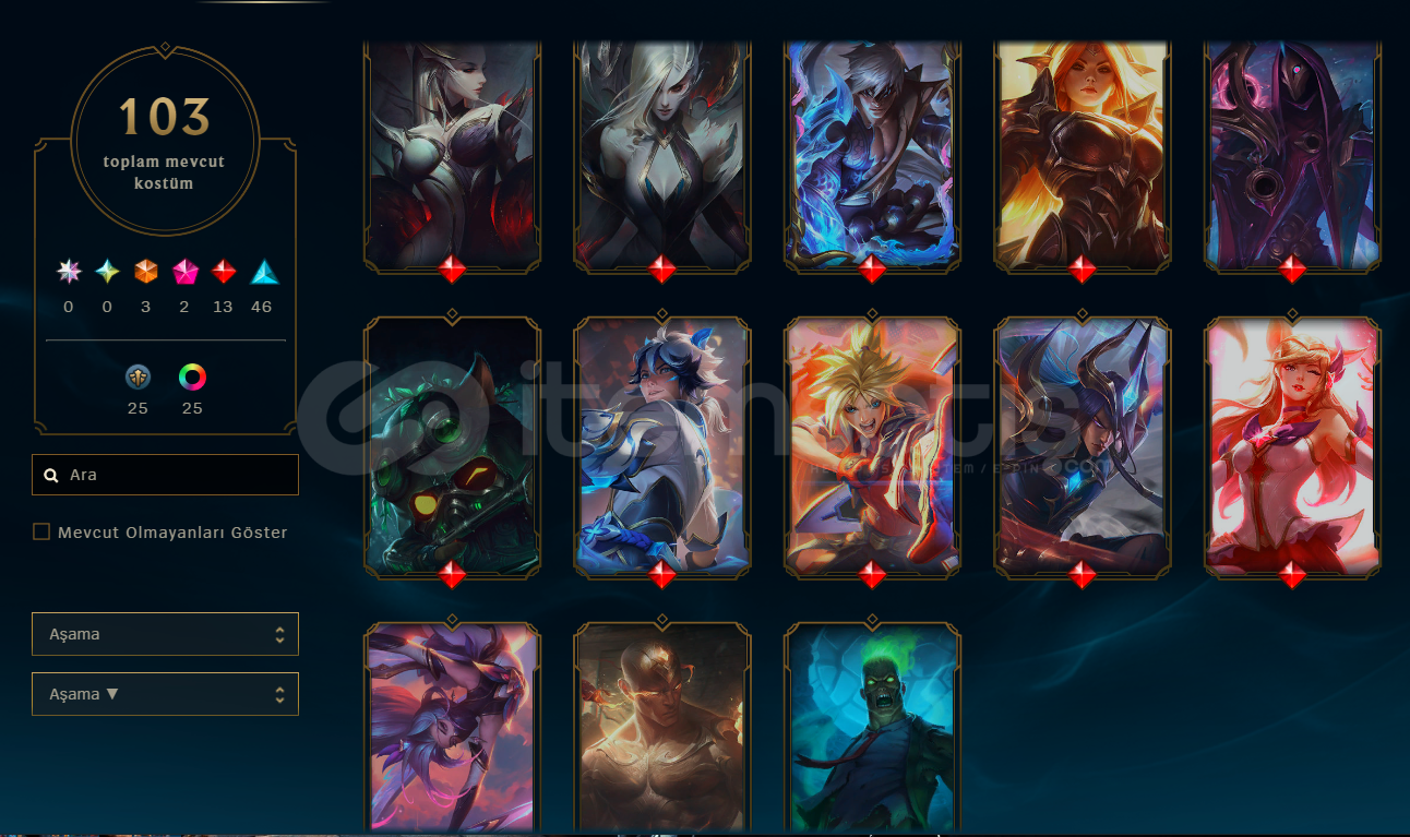 hesap 7 yıllıktır eu batı sunucusunda master bitirmiştir içindeki skinler çok değerlidir sadece 25hero eksik (36k mavi öz var) 103skin vardır koymadıklarım dahil