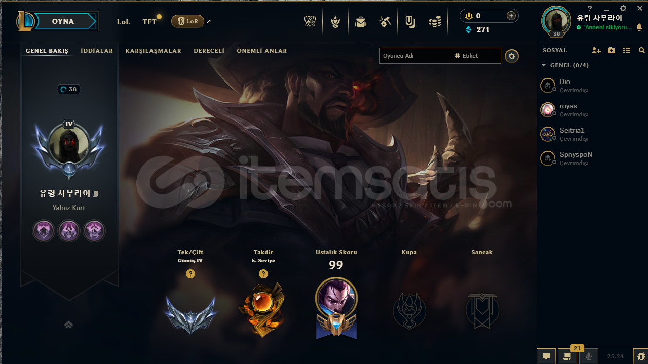 Vahşi Batılı LucianHiçlik Öncesi KassadinRuh Çiçeği SyndraVahşi Batılı DariusSavaş Ustasu KatarinaGerisi tırt.Sorunsuz.Derceli hazır.