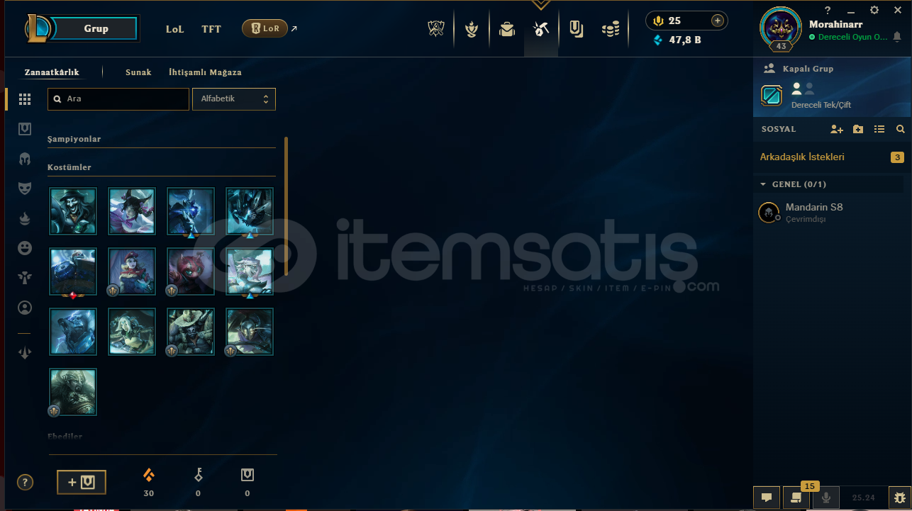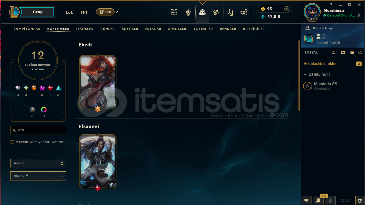 ÇELİK İNTİKAM MİSSFORTUNE - EBEDİ KOSTÜMPULSFİRE CAİTLYN - EFSANEVİ KOSTÜMMEKA SIFIR SİON - EFSANEVİ KOSTÜM12 AÇIK 13 AÇILABİLİR KOSTÜM43 LEVEL47K MAVİ ÖZTEK ÇİFT ZÜMRÜT 3ESNEK GOLD 1 (YERLEŞTİRİLMEMİŞ) + 50LPMAİL DEĞİŞECEKTİR
