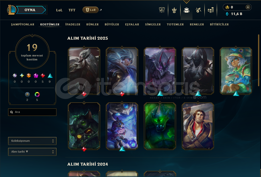 Selamlar hesap gold 3 olup 19 kostum bulunmaktadır (9 destansı 5 efsanevi kostum mevcuttur)( Efsanevi Kostumler : Kod adı pyke , Gölge Dövmeli Master yi , Yüce Kral Darius , Şafağın Kılıcı Riven , Omega Timi Teemo )( Destansı Kostumler : Kanlı Ay Master Yi , Kanlı Ay Aatrox , Yağmur Çobanı millio , Kozmik Paladinler nunu , Kral Viego , Robot amumu , Süper Galaksi Fizz , Cadı Yuumi , Tüyl&uu...