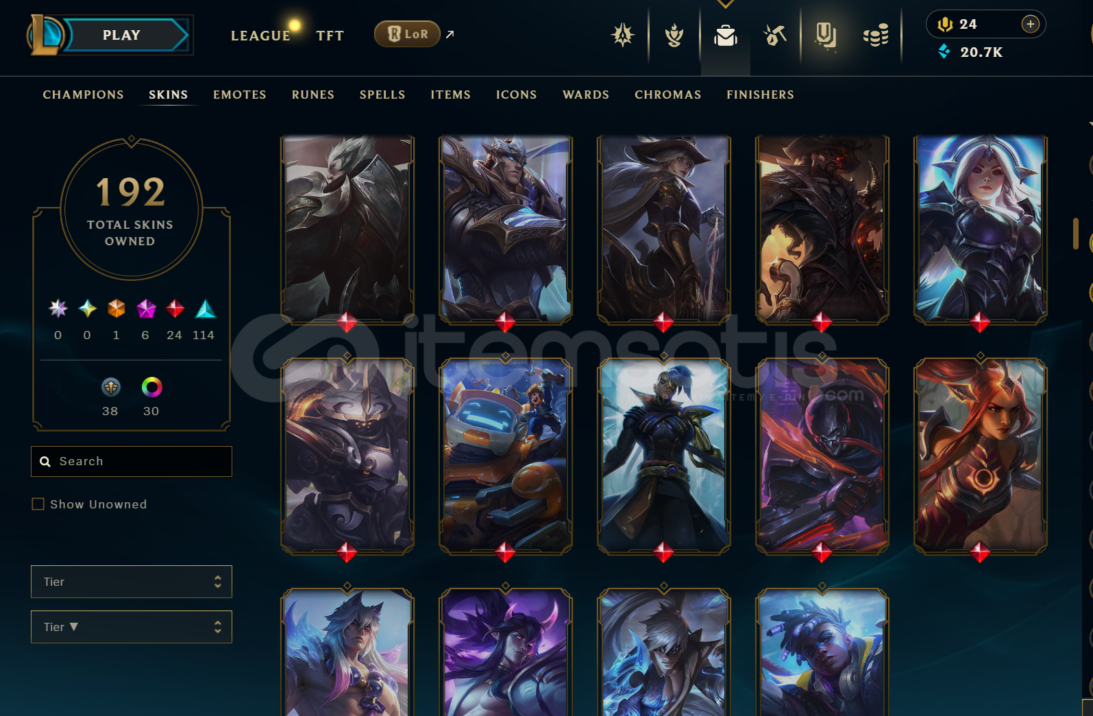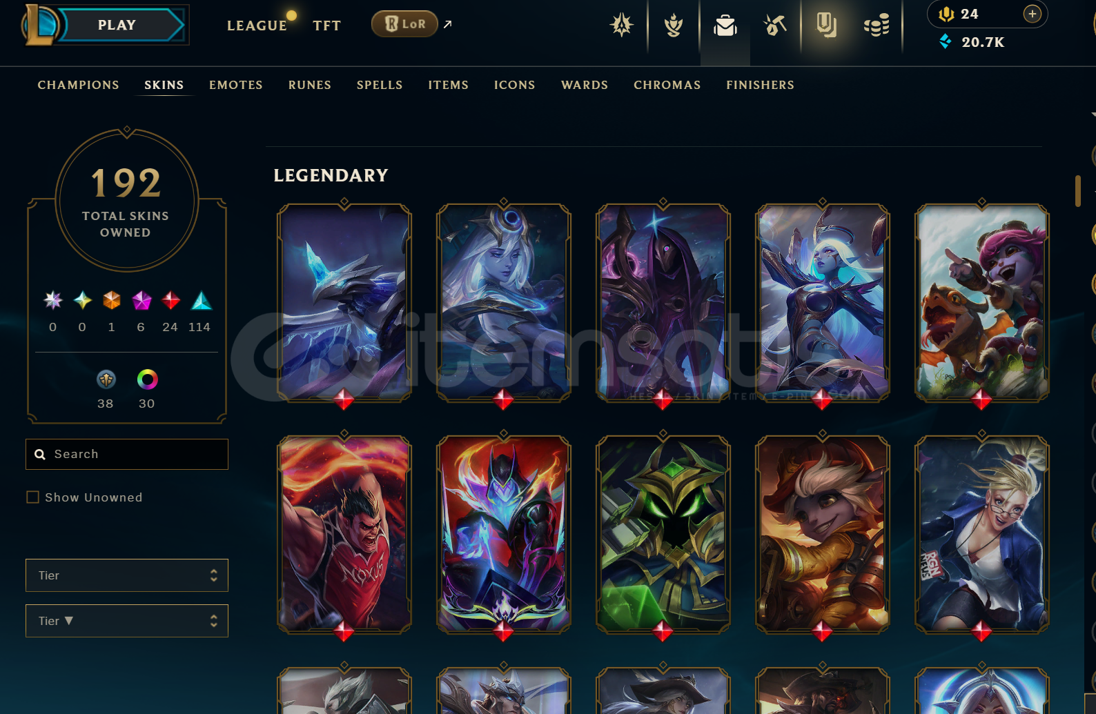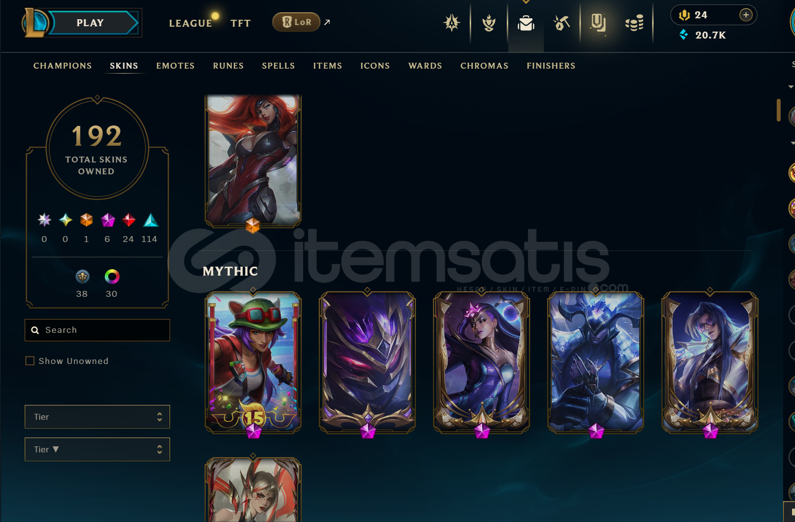 hesabın lolünde 192 skin mevcut(6 prestij,24 efsanevi,114 destansı),tüm şampiyonlar açık.
