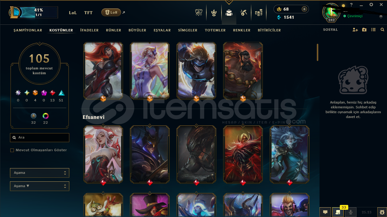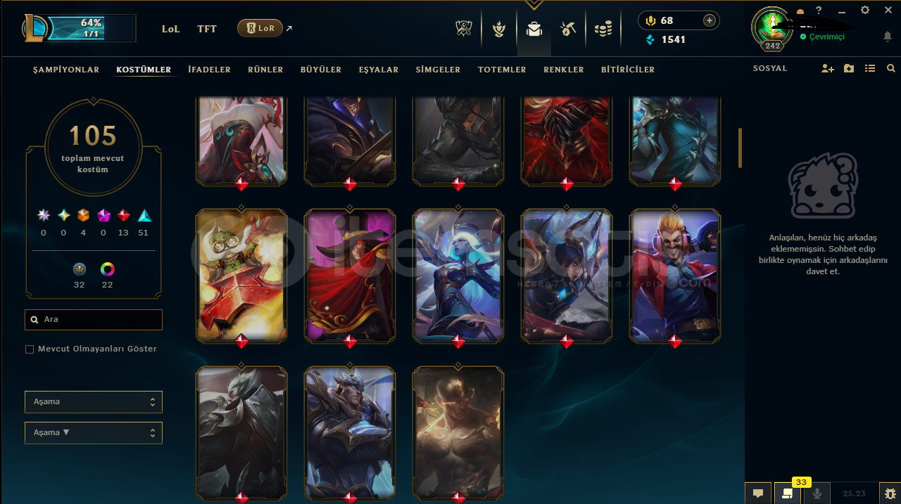 4 Ebedi Kostüm 13 Efsanevi Kostüm 51 Destansı Kostüm 32 Harıta Kostüm 22 Adet renk mevcut bot hesap değildir Çarı tr de iken satın aldım euw ye aktardım trdeki rp kodları euw de geçerli. Pazarlık yaparız.1 iade hakkı var isim değiştirme hakkı yok