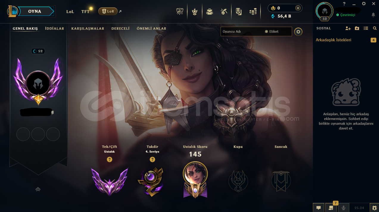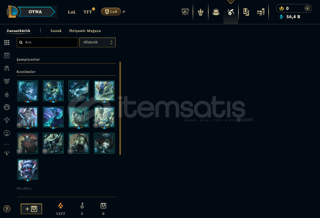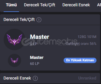 Bölge EUWEpostası onaysızdır direkt kendi epostanıza geçirebilirsiniz telefon bağı yokturHızlı teslimatSeviye: 52Mavi öz: 56496Takdir seviyesi : 4Solo rütbe: master 128w 101l 56% wrHerhangi bir sıra veya ban cezası yoktur===================== LoL Envanteri =====================Şampiyonlar 28Kostümler 1+13 kristalSimgeler 42İfadeler 8Totemler 3Hesap garantilidir herhangi bir sıkıntıda de...