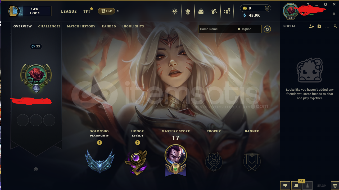 22 WIN 17 LOSEHESAPTA E POSTA ONAYI YOK DOLAYISIYLA AKTİF OLMAMI BEKLEMENİZE GEREK YOK SATIN ALIP ÜSTÜNÜZE ALABİLİRSİNİZ.BAN RİSKİ YOK 30 LEVELUNRANKEDDAN ALINMIŞTIR.LOLÜN YENİ SİSTEMİ DEMOTEDAN ETKİLENMEZ.KURTARMA BİLGİLERİ MEVCUT.