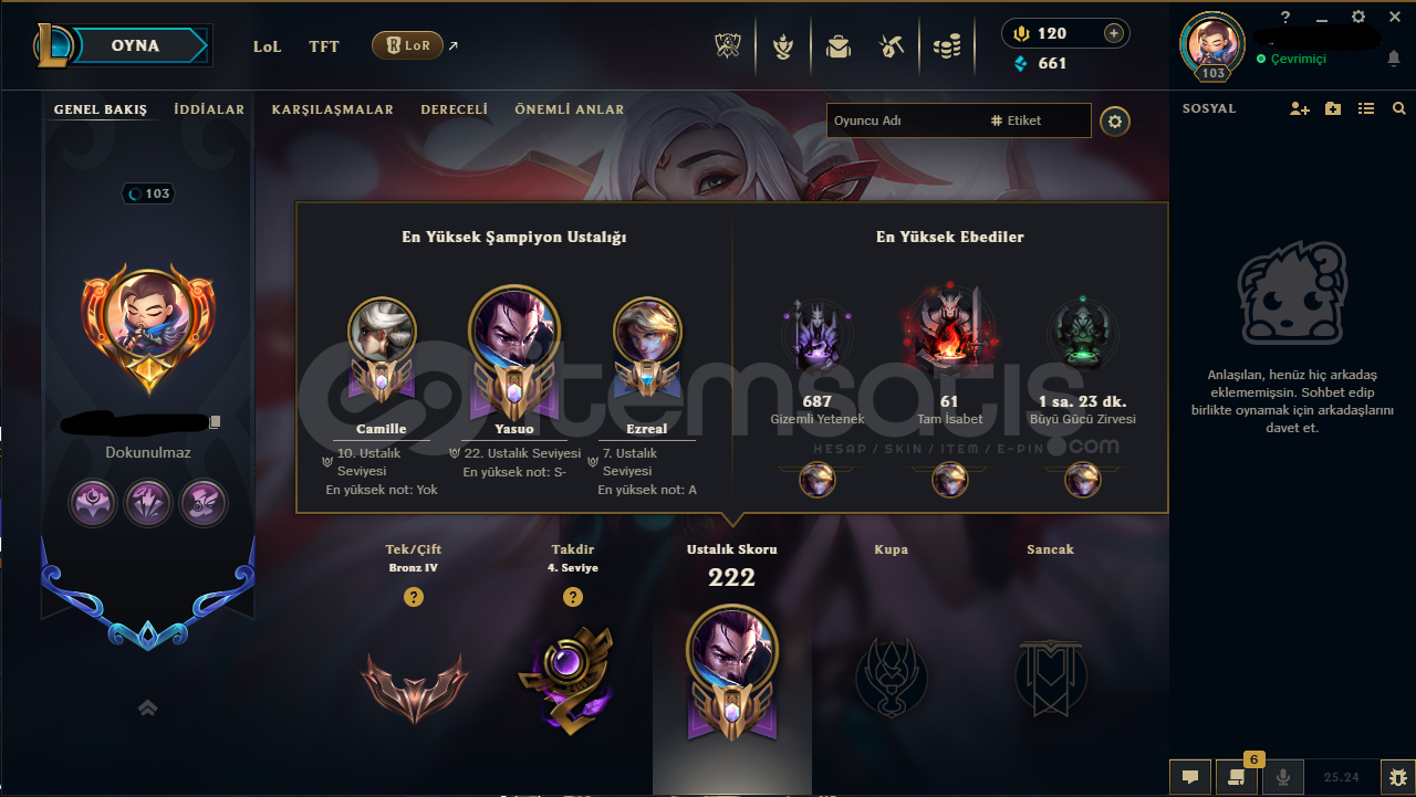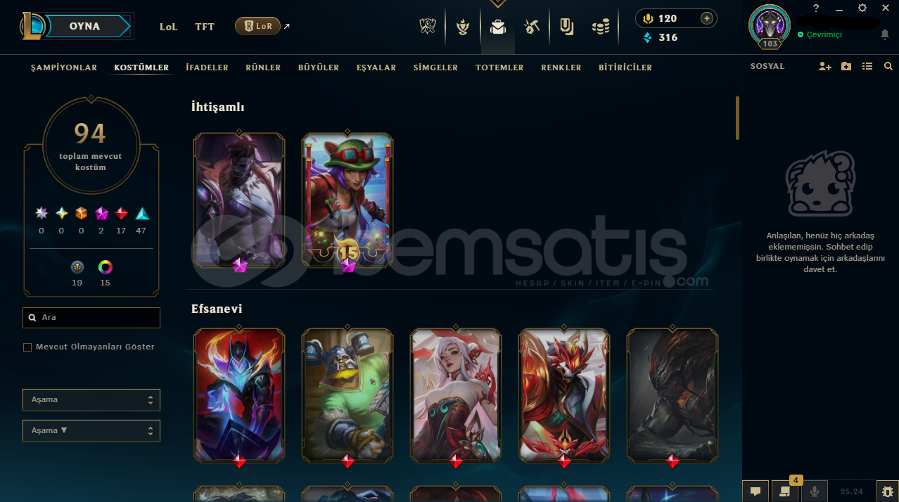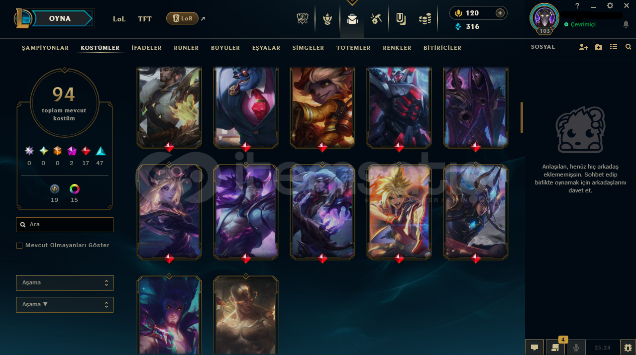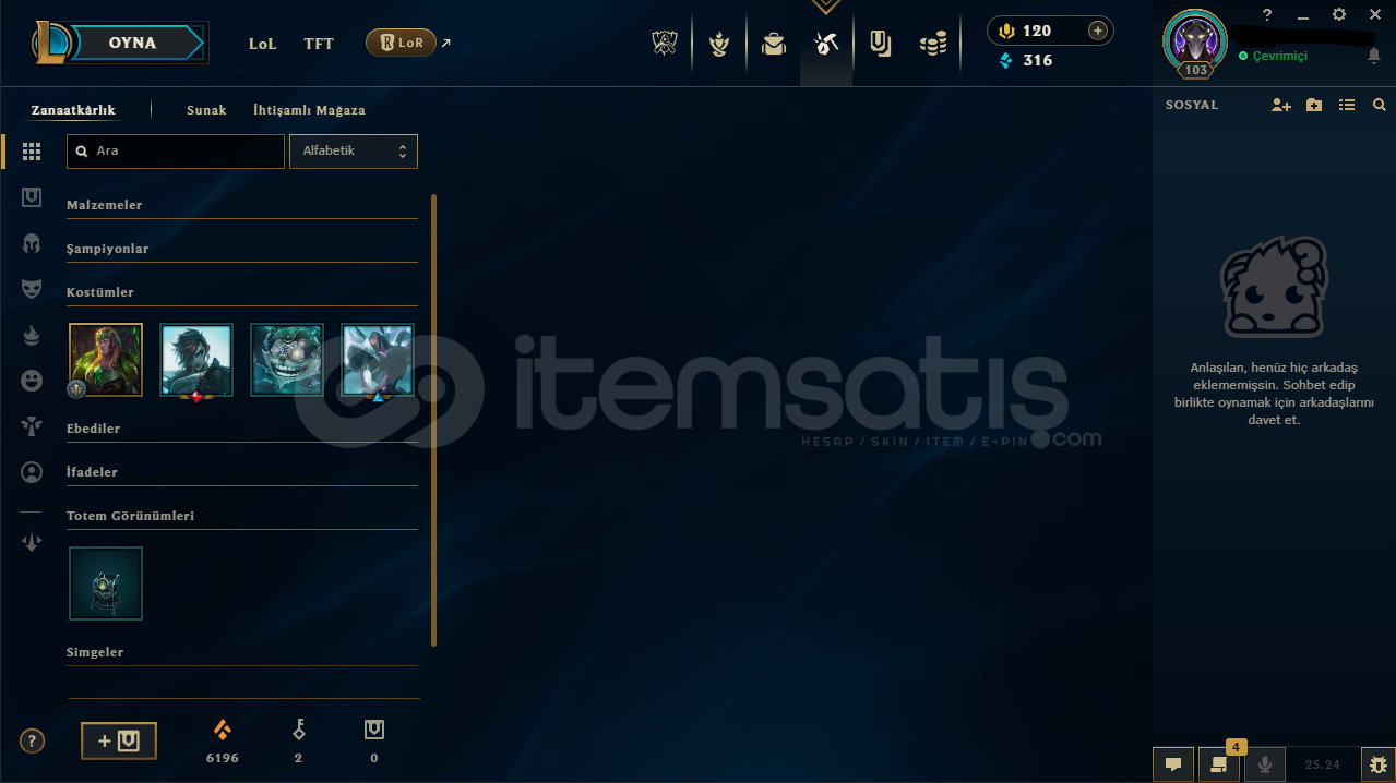 Hesabın E-Posta'sı ve Tüm bilgileri değiştirilebilir.Teslimatlar Otomatik Yapılmaktadır, 7/24 satın alabilirsiniz. Hemen Eposta - Şifre - Mail Teslim edilmektedir.Dereceli Direkt Girilebilir.316 Mavi Öz & 6196 Turuncu Öz + 4 Ganimet Bulunmaktadır.Hesabınızı satın aldıktan sonra sizden başka kimsenin erişimi olmaz..103 Level + BRONZ IV (TR) Hesaptır.94 Kostüm ve 80 Şampiyon bulu...