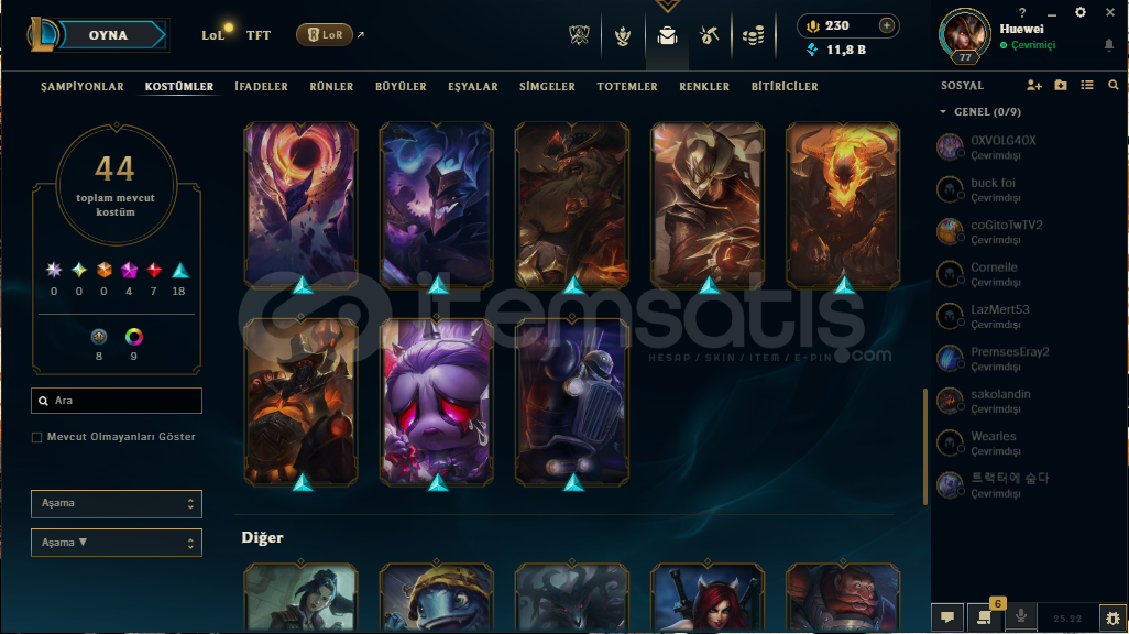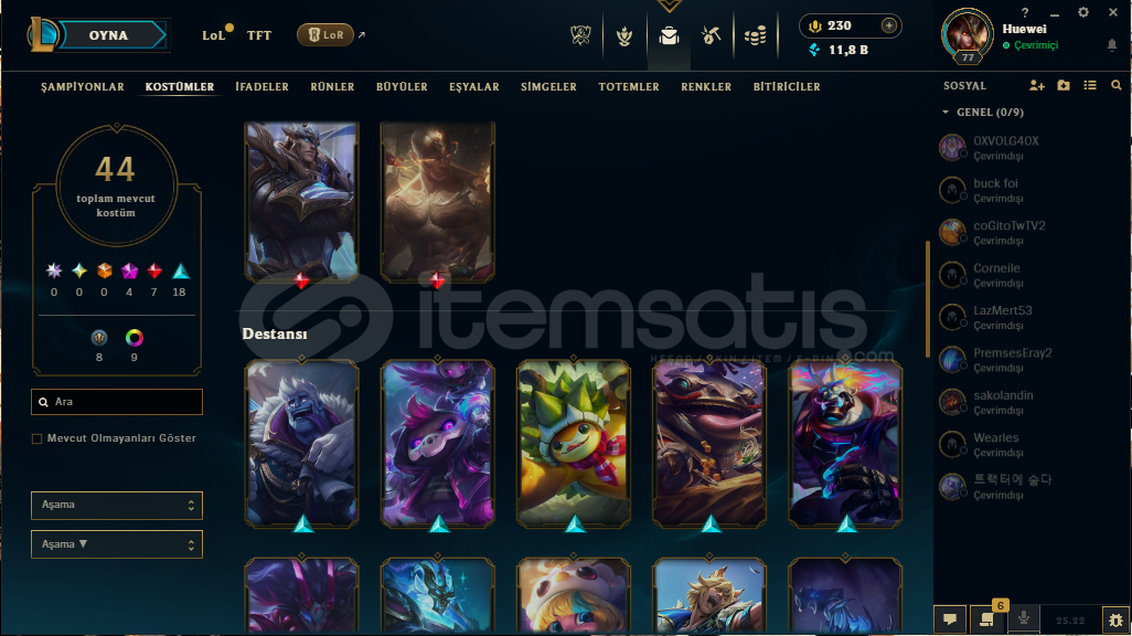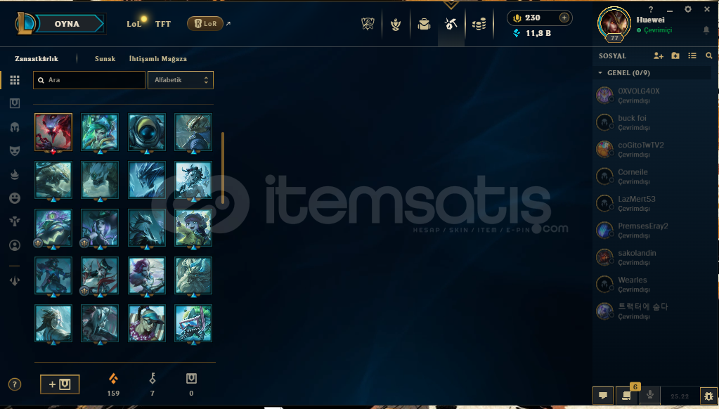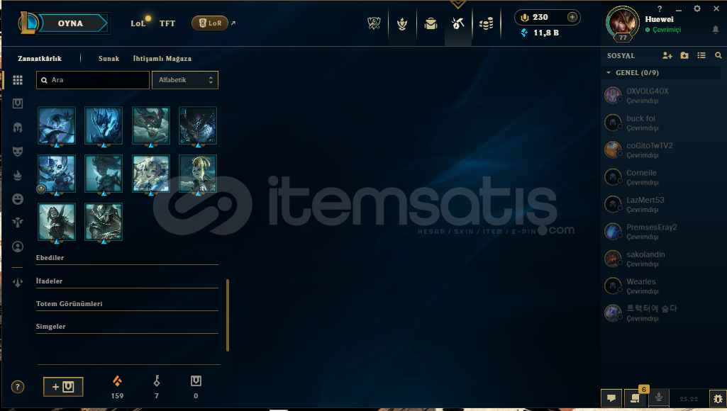 Hesapta Uzlaştırıcı Vahşi Batılı YonePrestij Kışın Seçilmişi WarwickKristalis KhazixVe daha bir çok değerli skin bütün skinler değerlidir değersiz skin yoktur ayriyetten skin dönüştürme yerinde 50 tane skin vardır hepsi değerlidir fotoğraflarda görebilirsinizTakdir seviyesi 4Sormak istediğiniz soru varsa sorabilirsiniz.Uzlaştırıcı Vahş...
