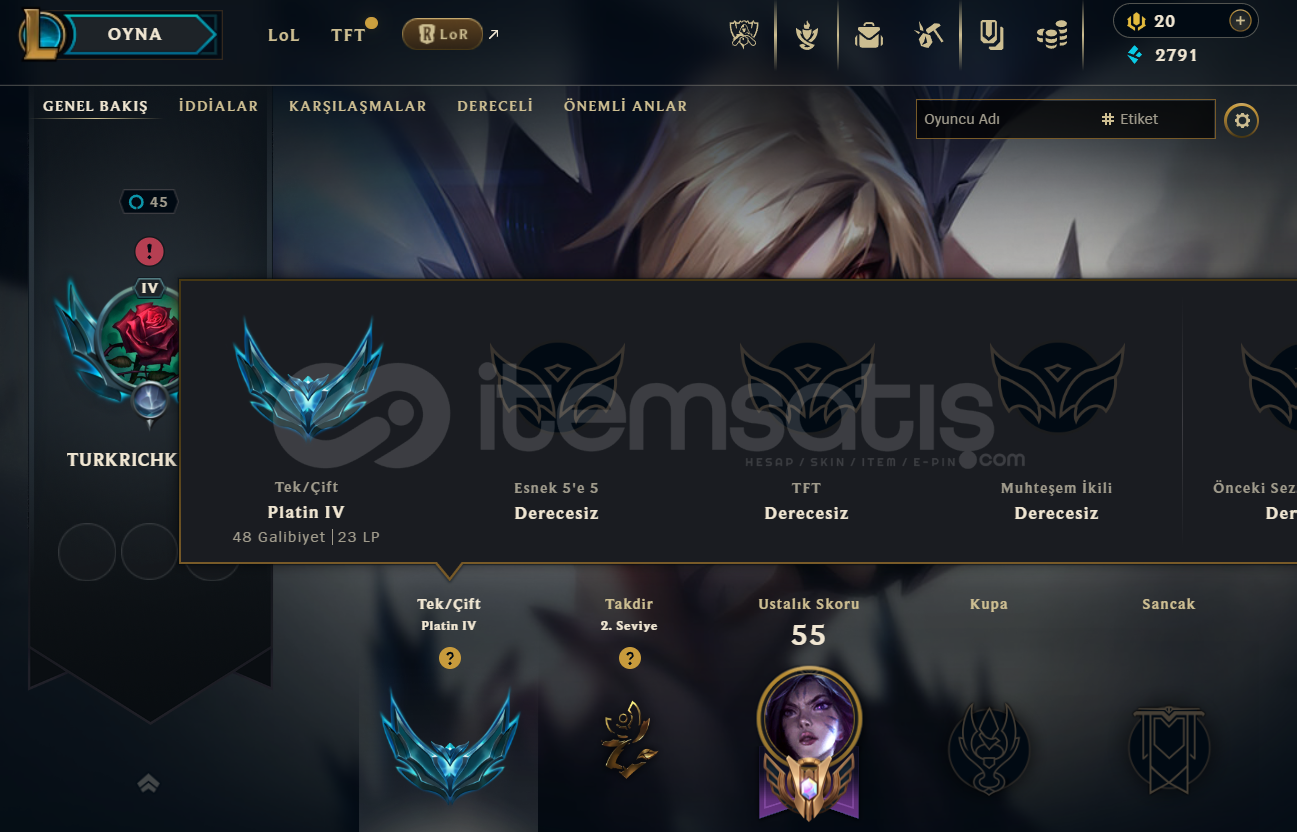 Hesap plat4 tüm kostümler fotoğrafta.Hesaptaki ban sadece 20 mac boyunca dereceli mac girmenizi engeller 20 tane normal maç attığınızda dereceliye girebilirsiniz küfür bani değildir.Hesabı aldığınızda sizin mailinize geçirilecektir. Aktif değilken alabilirsiniz aktif olduğum an ilgileneceğim.