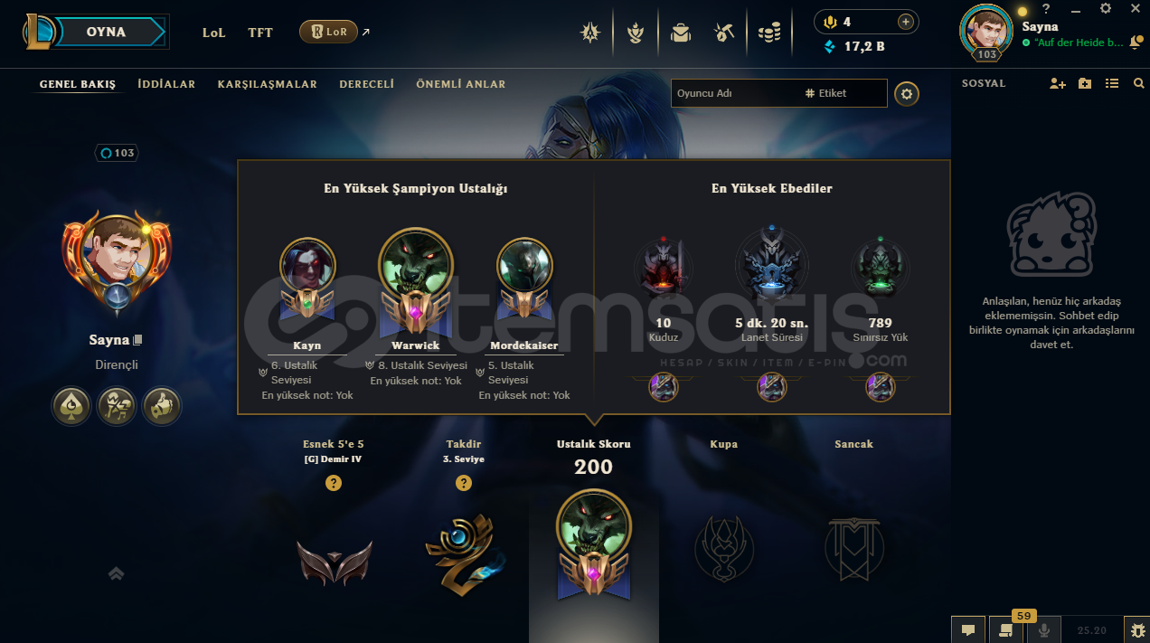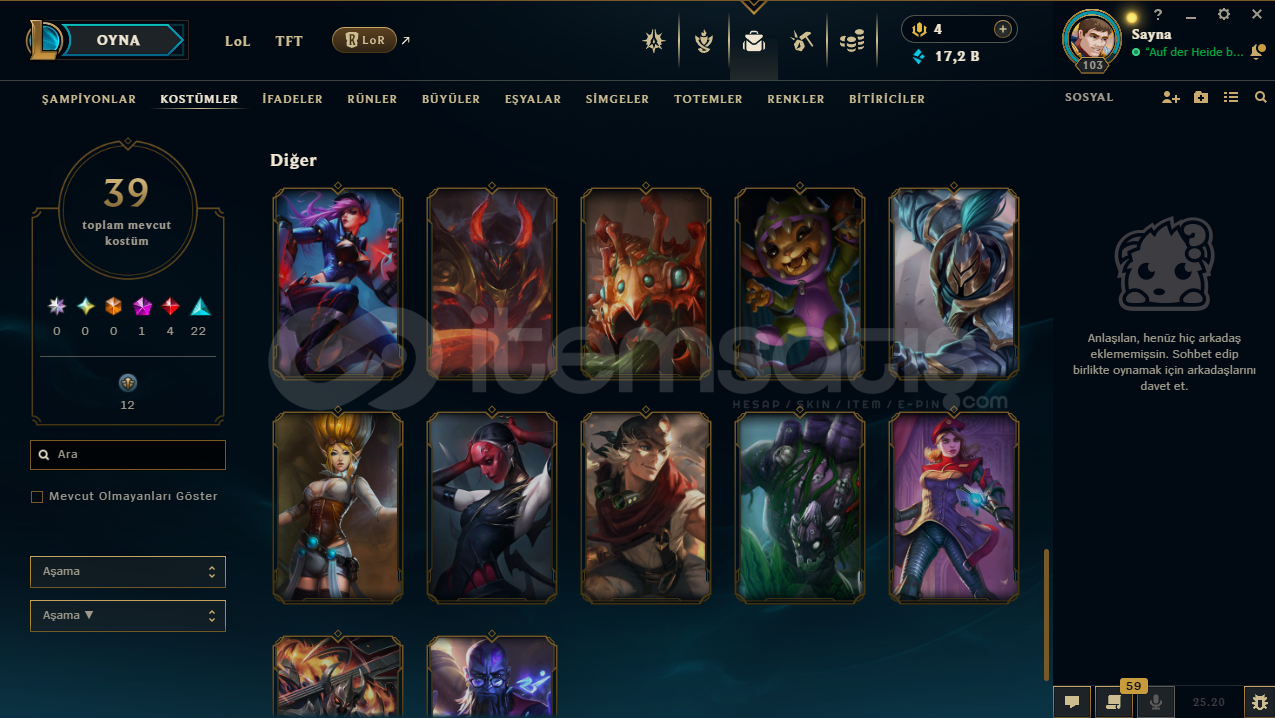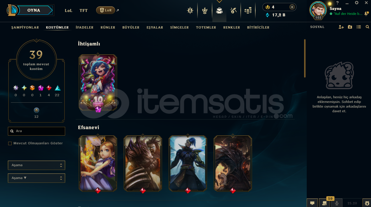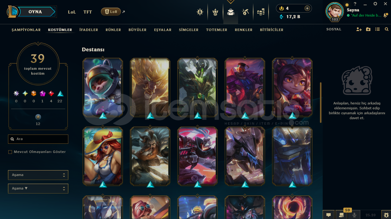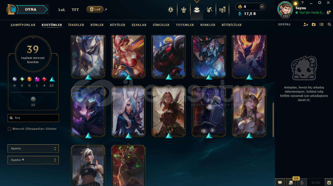 hesapta 70 şampiyon, 39 kostüm, 17,246 mavi öz vardır.