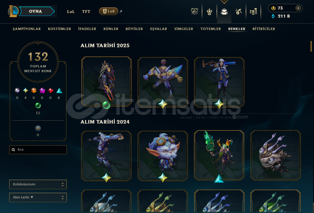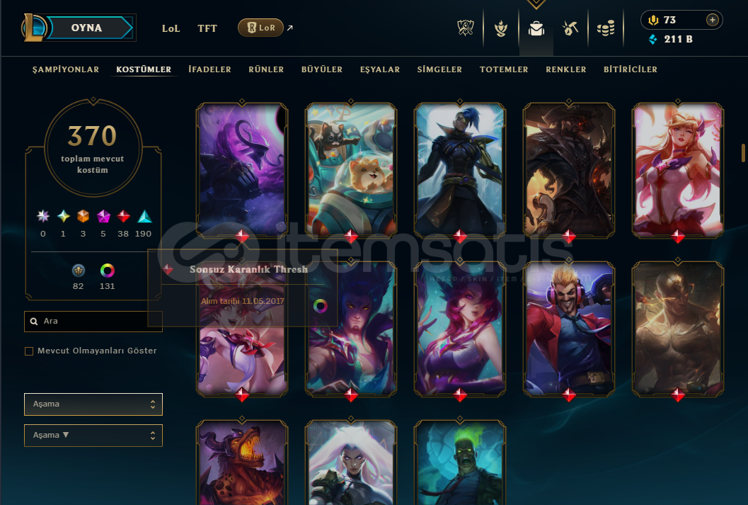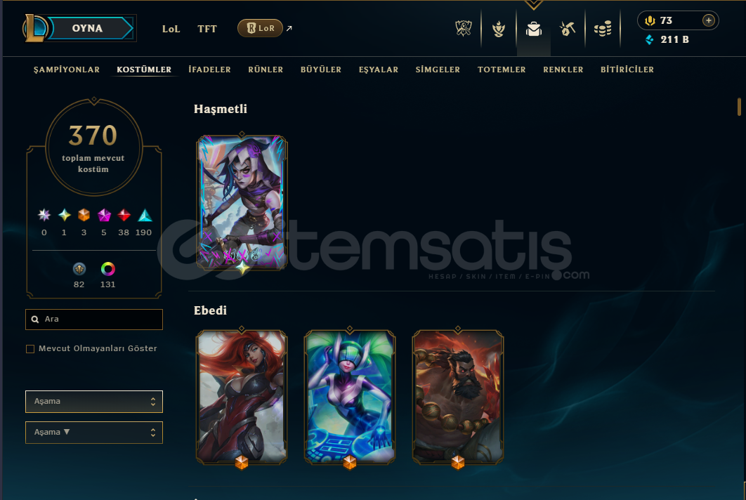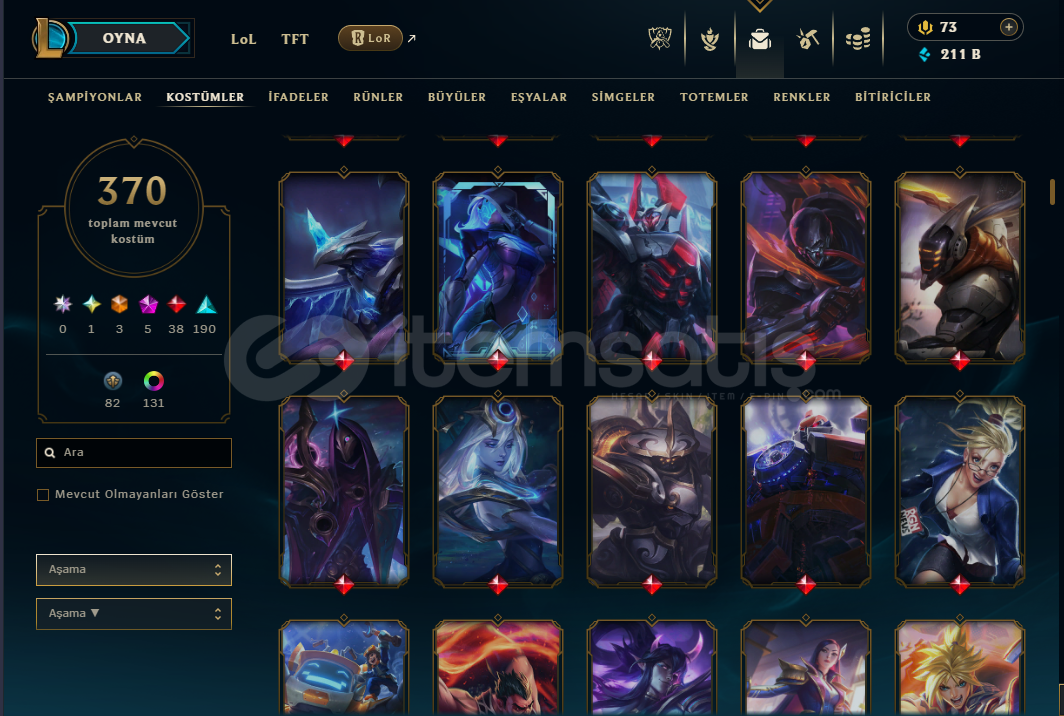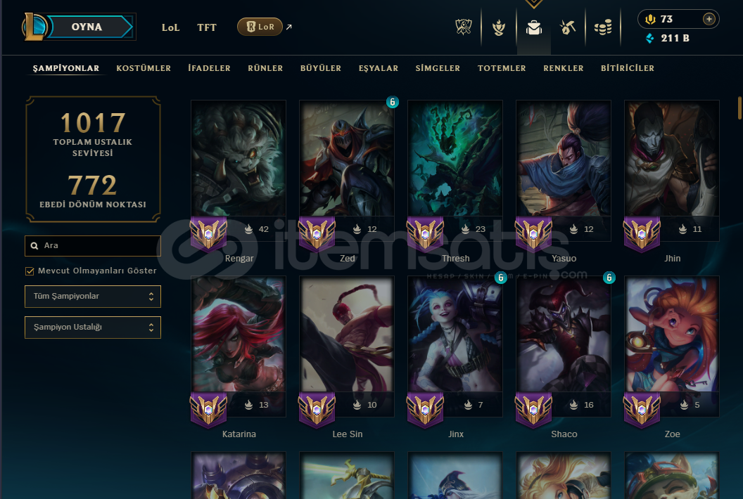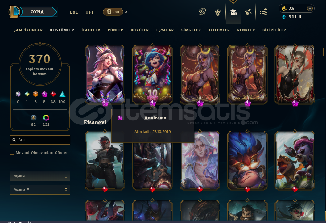 içeresinde 370 adet kostüm bütün şampiyonlar açık ve ilave 211 bin mavi öz var 1. maili maalesef veremiyorum kişisel hesaplarımda bağlı olduğu için mail değişimi yapabiliriz sadece acil paraya ihtiyacım olduğu için satıyorum.içerisinde değerli kostüm olarakarcane: paramparça jinxçelik intikam miss fortune dj sonaruh bekçisi udyr amiral savaş tav&#...