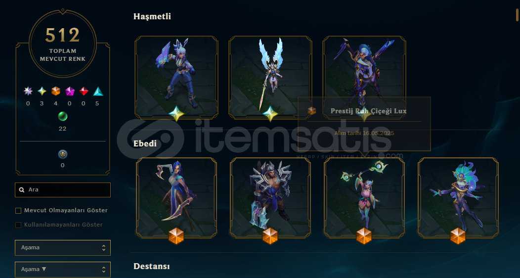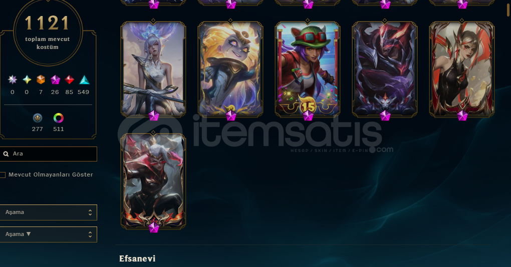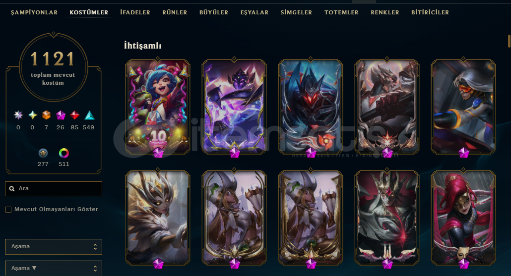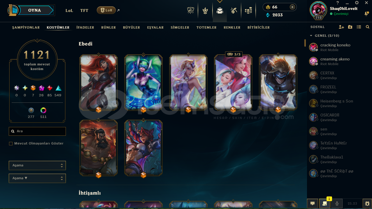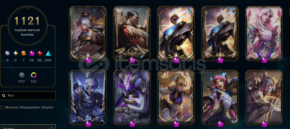 Hesapta 1121 kostüm ve 512 renk paketi bulunmaktadır.Ayrıca CHİBİ K/DA OUT AKALİ BULUNMAKTADIR.8 YILLIK LOL HESABIDIR.HESAP HİÇ BAN YEMEMİŞTİR. KUANTUM TEKNOLOJİ ZED KUTLU YÜCE KRAL DARIUS YİTİK YÜCE KRAL GAREN VE NEO PAX SİVİR BULUNMAKTADIR