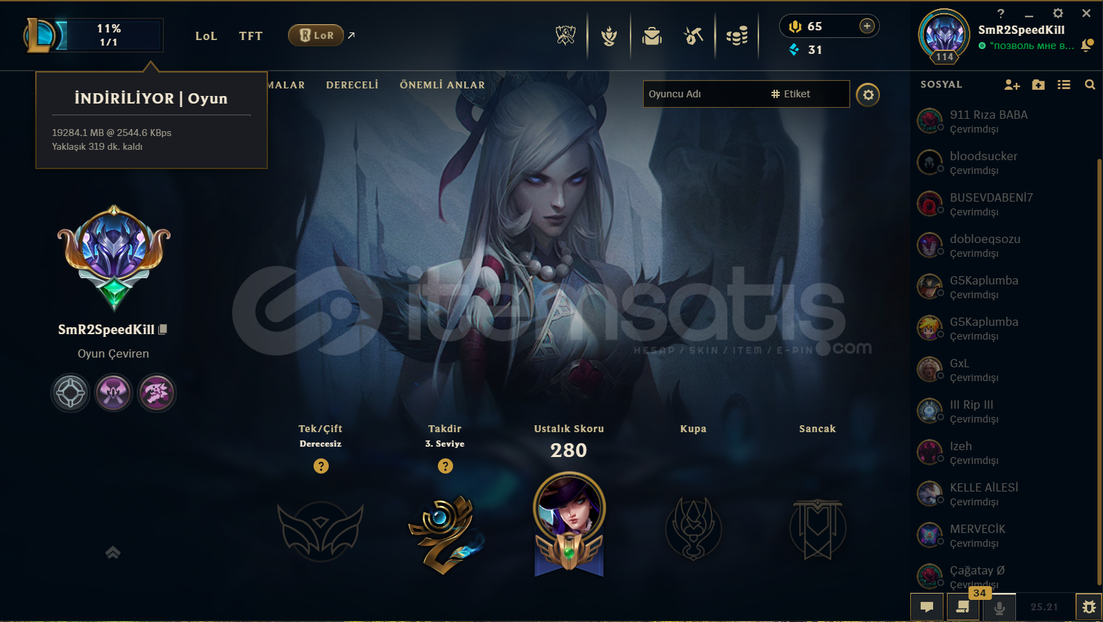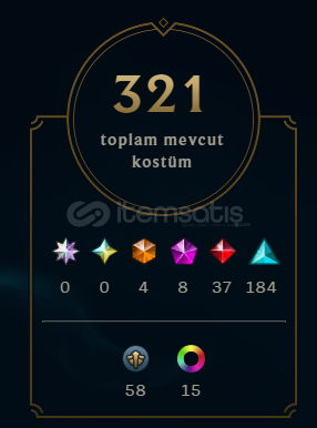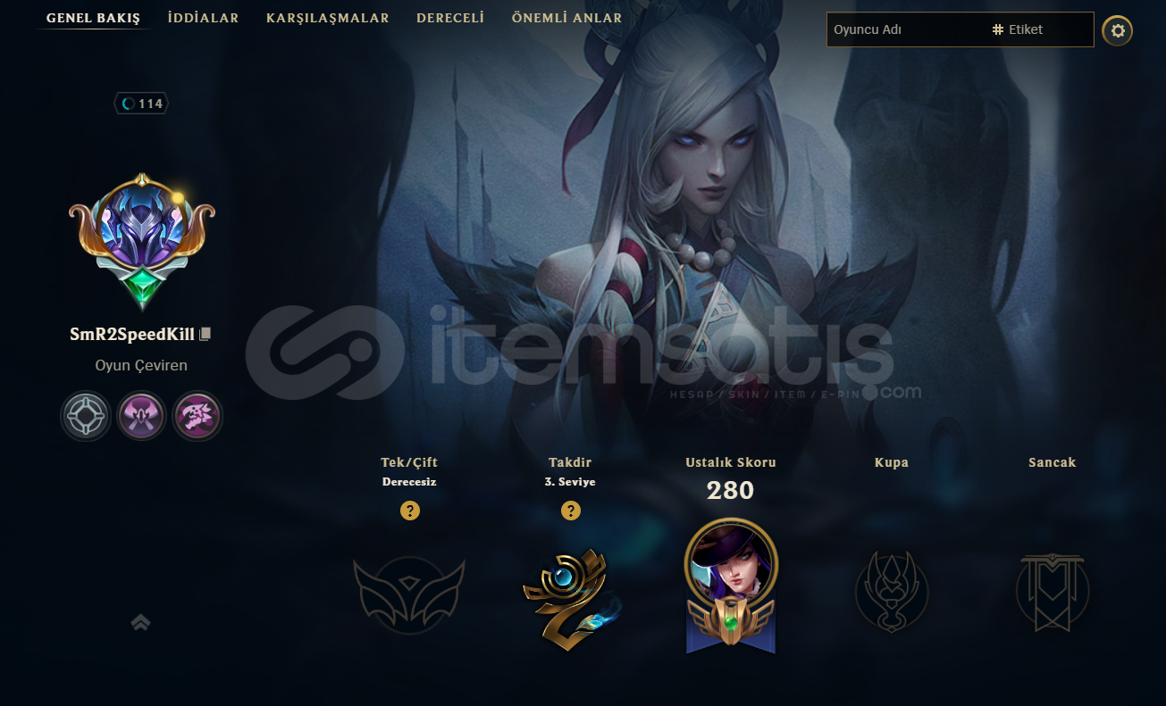 114 LEVEL oyunu bıraktığım için unranked fakat ilk 10 maç tamamlandıktan sonra plat başlar. hesapta 314 kostüm mevcut açık olmayan 26 şampiyon var. 127 simge 22 totem 16 renk paketi 124 ifade mevut. Oynadığım zamanlar yüksek mmr bırakmıştım. Aynı zamanda Full+Full TFT Hesabıdır. TFT'de geçen sezon Elmas Bitirildi.