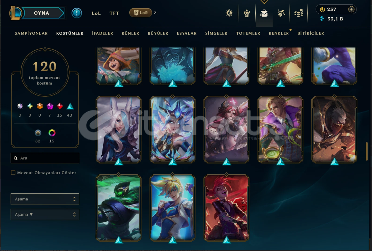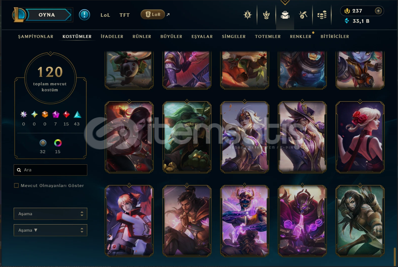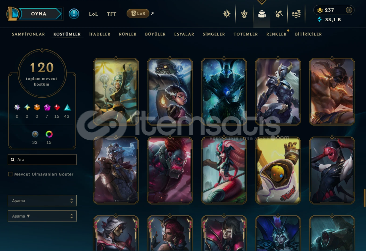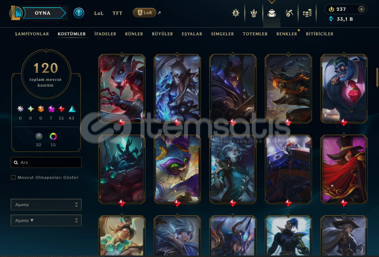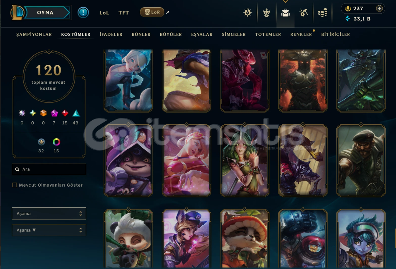 121 SKİN 336 LVL MAİNLİK DOPDOLU HESAPPAZARLIK YAPILIRHesabım gayet uygun fiyatadır 2017 den beri oynuyorum