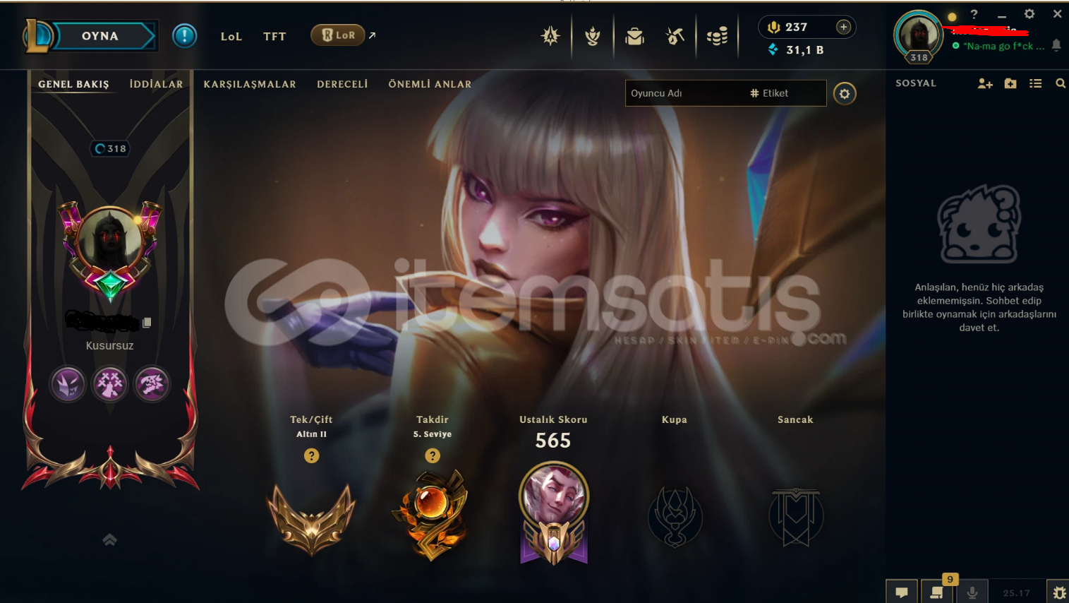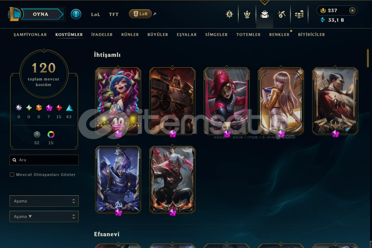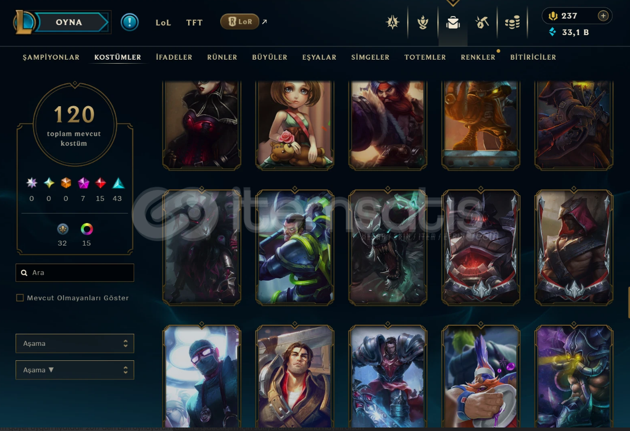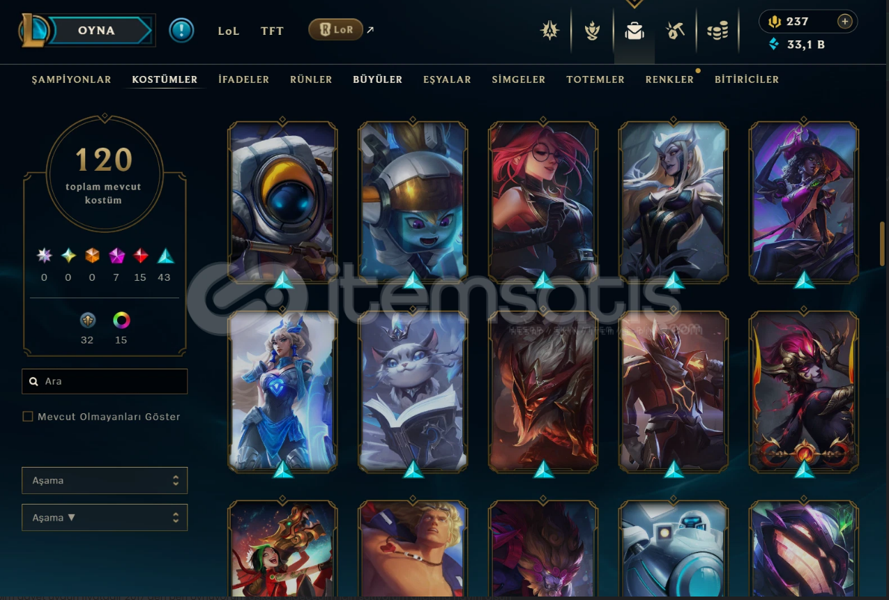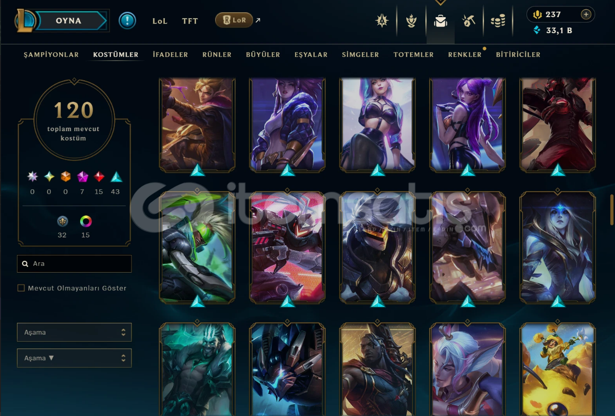 121 SKİN 336 LVL MAİNLİK DOPDOLU HESAPPAZARLIK YAPILIRHesabım gayet uygun fiyatadır 2017 den beri oynuyorum