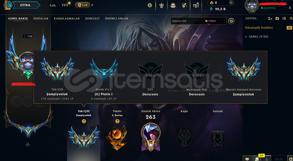 Hesap, aktif olarak oynanmış ve tamamen organik şekilde Challenger seviyesine ulaşmıştır. Hiçbir şekilde boost, bot veya üçüncü taraf müdahalesi bulunmamaktadır.Lig: ChallengerLP: 1300Winrate: %60Durum: Aktif ve sorunsuzPazarlık vardır.