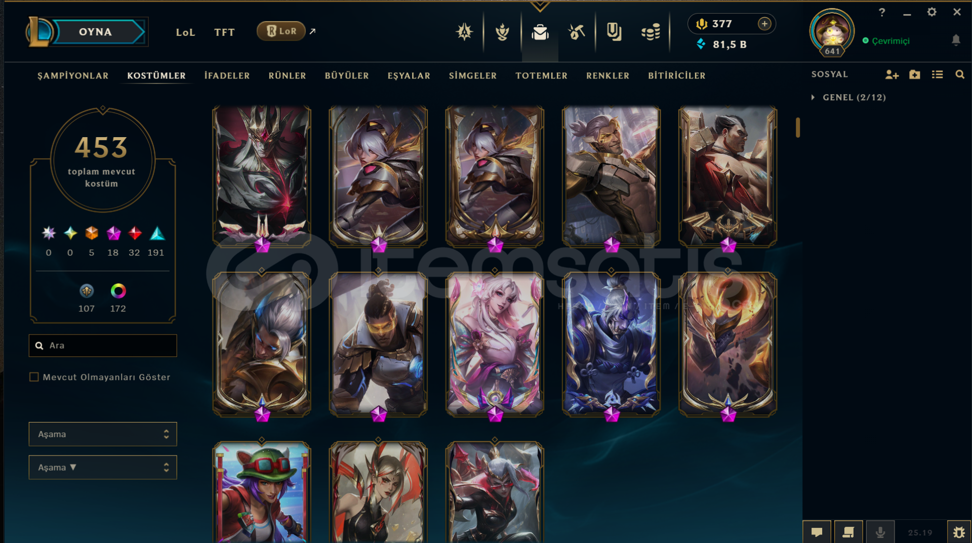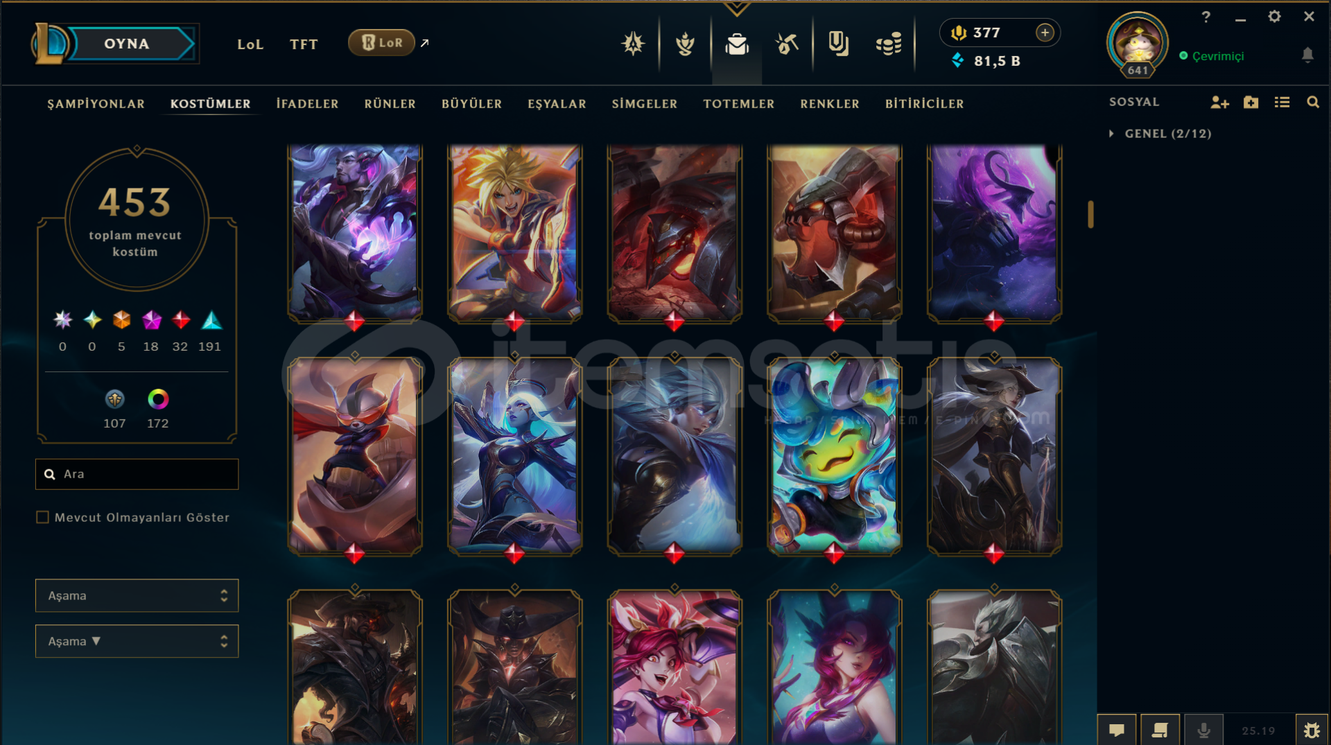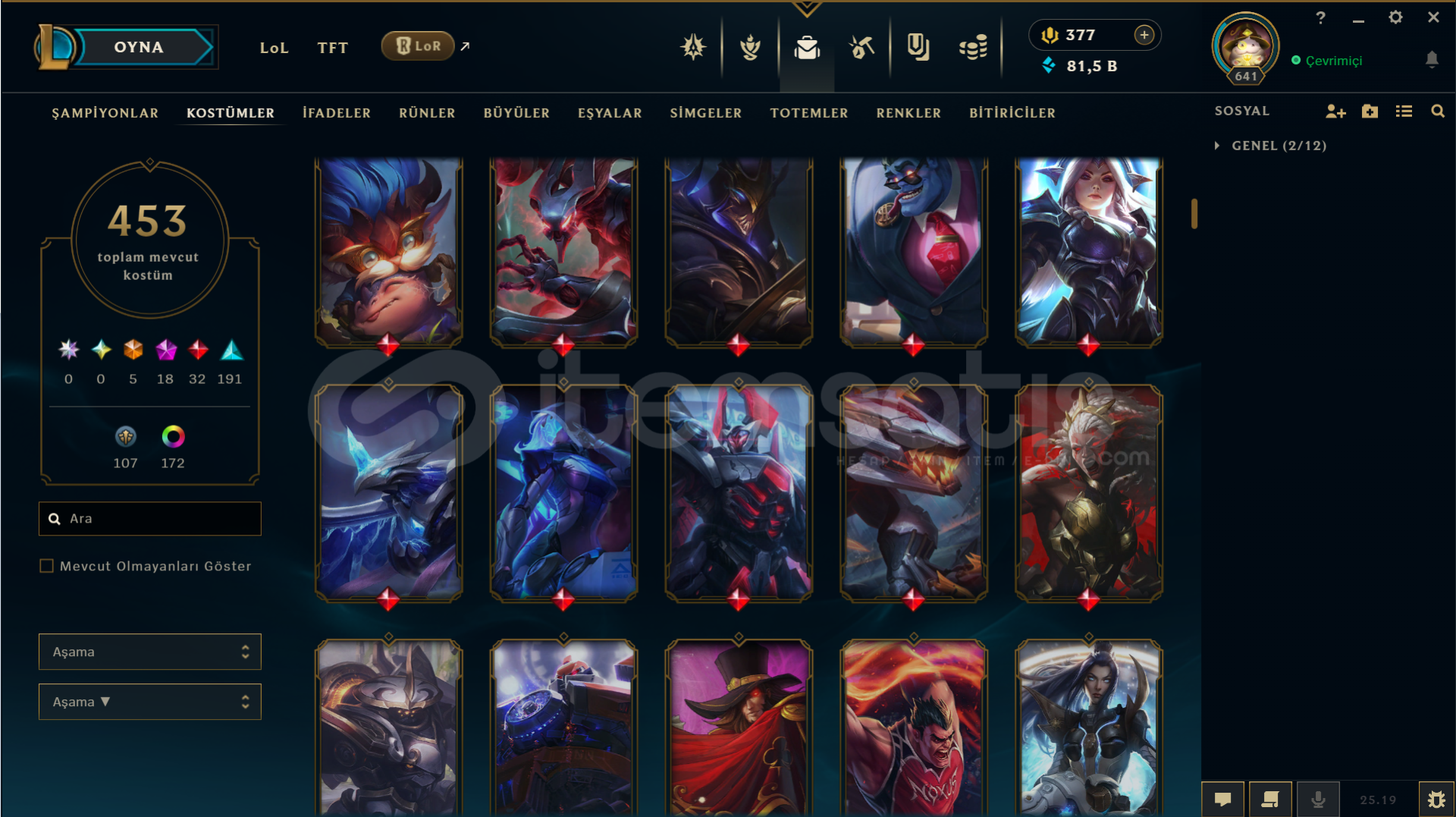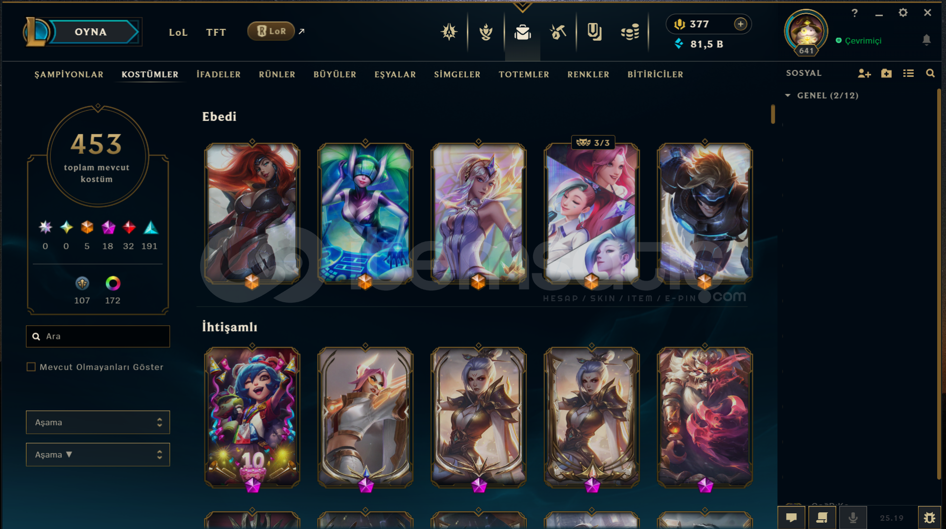 Neredeyse her heroda skin var bir sürü renk totem vb ne ararsanız her şey var 13 yılın 12 yılı aktif oynandı tft tarafı da dolu alıcısına hayırlı olsun mail telefon numarası her şey aktarılacaktır