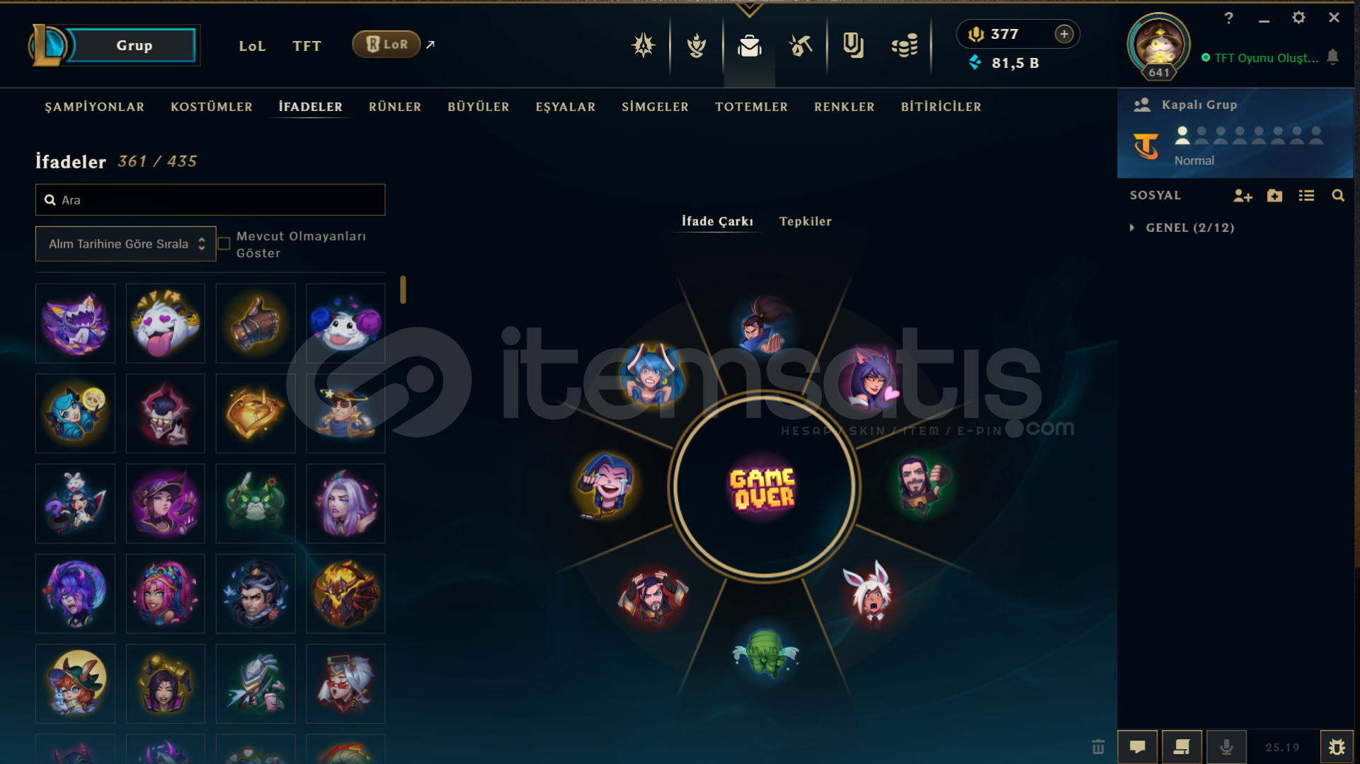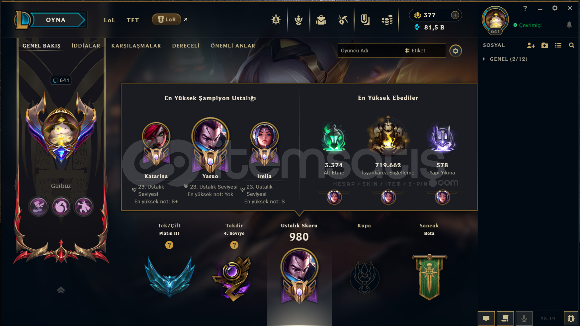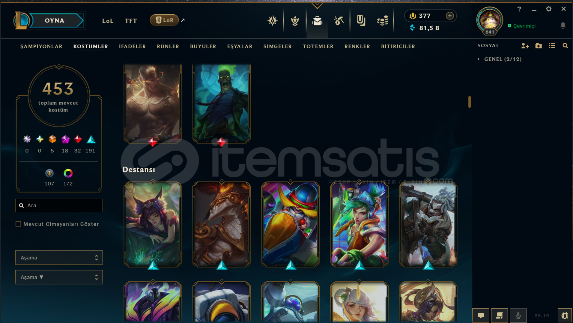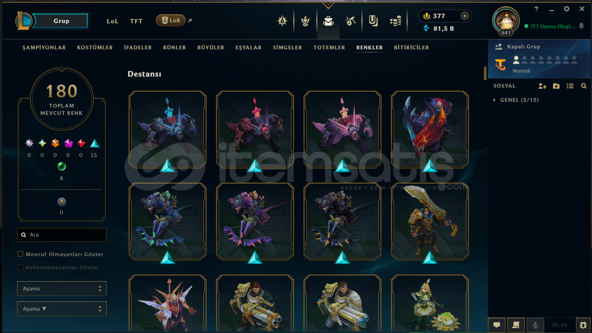 Neredeyse her heroda skin var bir sürü renk totem vb ne ararsanız her şey var 13 yılın 12 yılı aktif oynandı tft tarafı da dolu alıcısına hayırlı olsun mail telefon numarası her şey aktarılacaktır