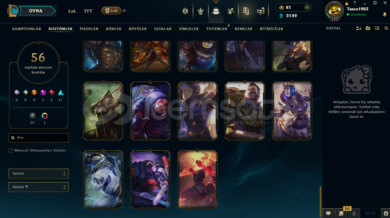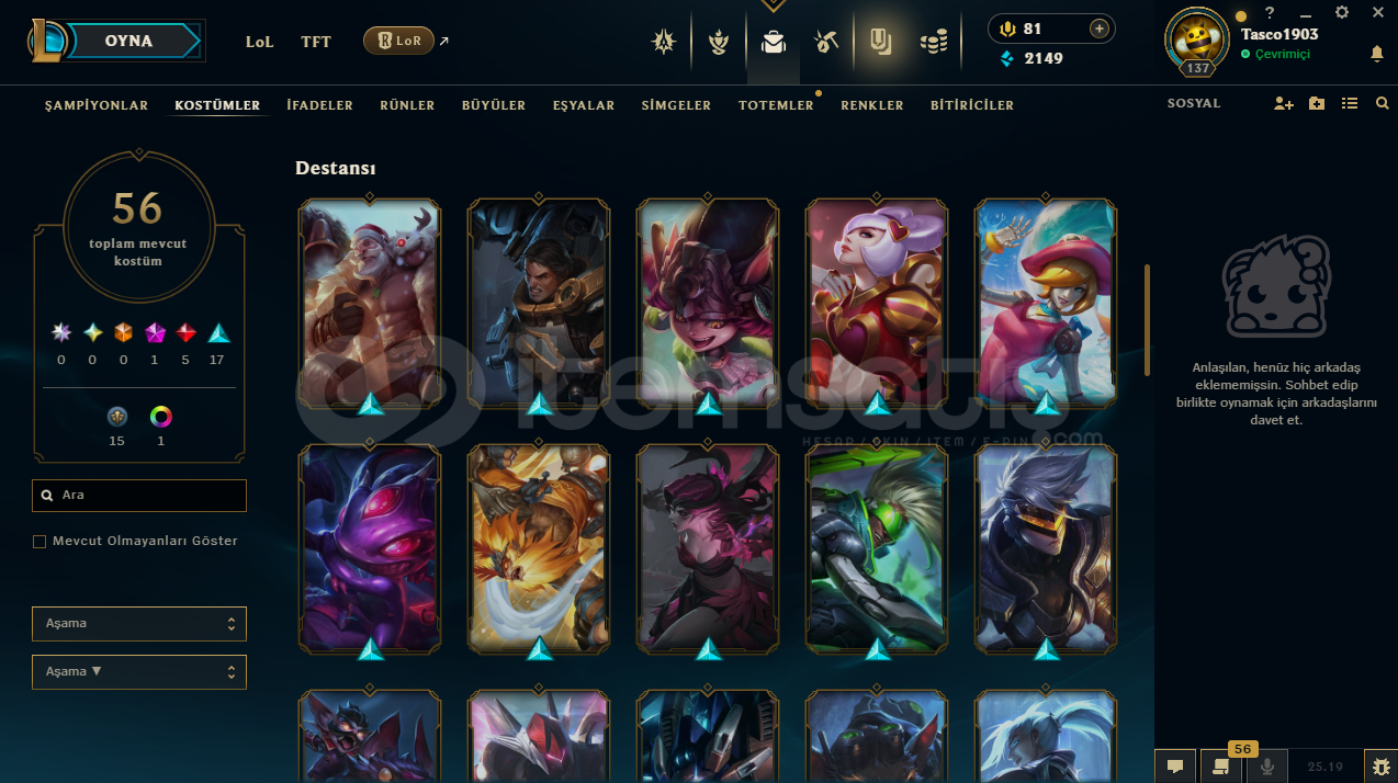 hesapta 109 şampiyon, 56 kostüm, 2149 mavi öz vardır.