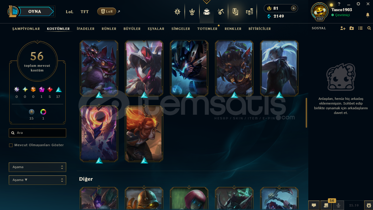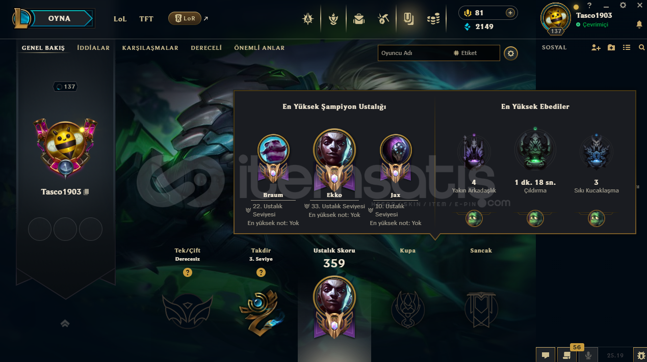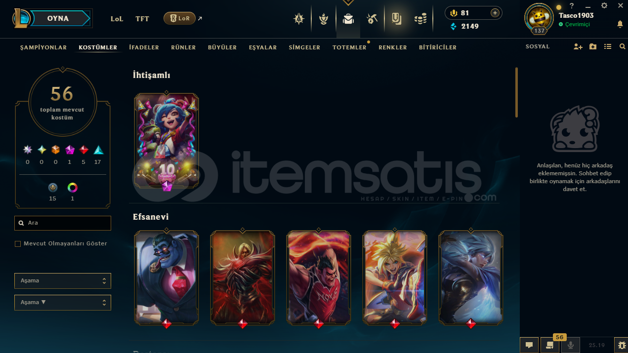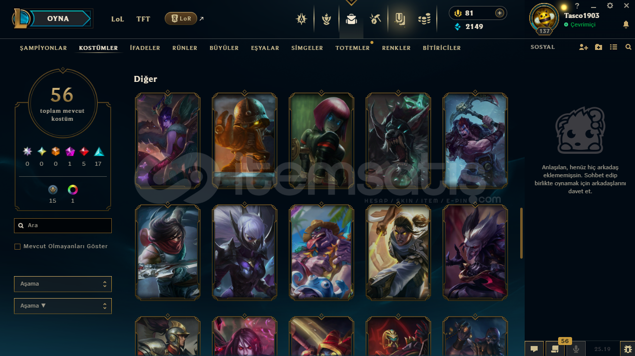 uygun bütçeli lol hesapları için profilime göz atabilirsinizhesap tr hesabıdır.hesabın maili değişmektedir.hesabın herhangi bir banı yoktur.hesap 3 takdir seviyesine sahiptir.hesapta 109 şampiyon, 56 kostüm, 2149 mavi öz vardır.hesapta 1 ihtişamlı, 5 efsanevi, 17 destansı kostüm vardır.ekran kaydı açmayı unutmayınız.