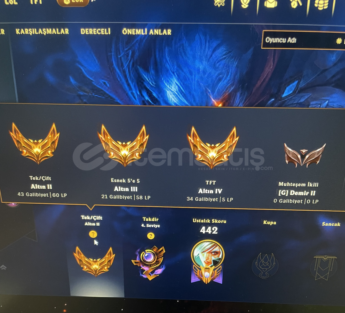 212 level, 2018 de elmasa çıkmış şuan tek/cift ve esnek eloları yüksek az galibiyet ile gold 1 ve gold 2 de Tft gold 4 muhteşem ikili oynanmadı "Ruh bekçisi Udyr" ,"Pulsefire Ezreal" ve sadece ilk çıktığı zaman alanlara özel olan yükleme ekranı simgeli Kod adı zed kostümü ve kod adı yasuo kostümü vardır bunun dışında "şampiyonlar şampiyonu Ri...