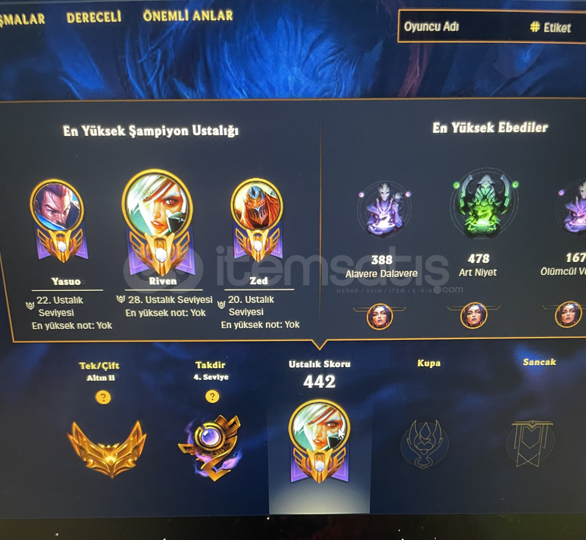 212 level, 2018 de elmasa çıkmış şuan tek/cift ve esnek eloları yüksek az galibiyet ile gold 1 ve gold 2 de Tft gold 4 muhteşem ikili oynanmadı "Ruh bekçisi Udyr" ,"Pulsefire Ezreal" ve sadece ilk çıktığı zaman alanlara özel olan yükleme ekranı simgeli Kod adı zed kostümü ve kod adı yasuo kostümü vardır bunun dışında "şampiyonlar şampiyonu Riven " Ejderkatili Riven" gibi nadir hatıra kostümleri vardır
