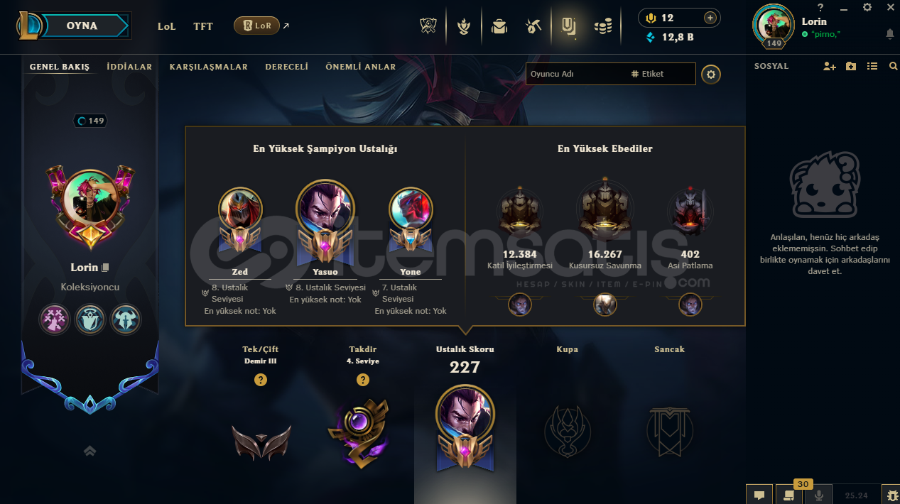 uygun bütçeli lol hesapları için profilime göz atabilirsinizhesap tr hesabıdır.hesabın maili değişmektedir.hesabın herhangi bir banı yoktur.hesap 4 takdir seviyesine sahiptir.hesapta 110 şampiyon, 42 kostüm, 12,867 mavi öz vardır.hesapta 6 efsanevi, 17 destansı kostüm vardır.ekran kaydı açmayı unutmayınız.