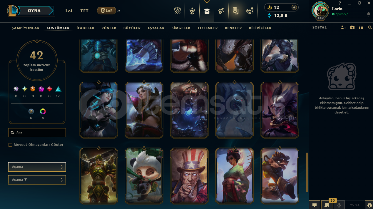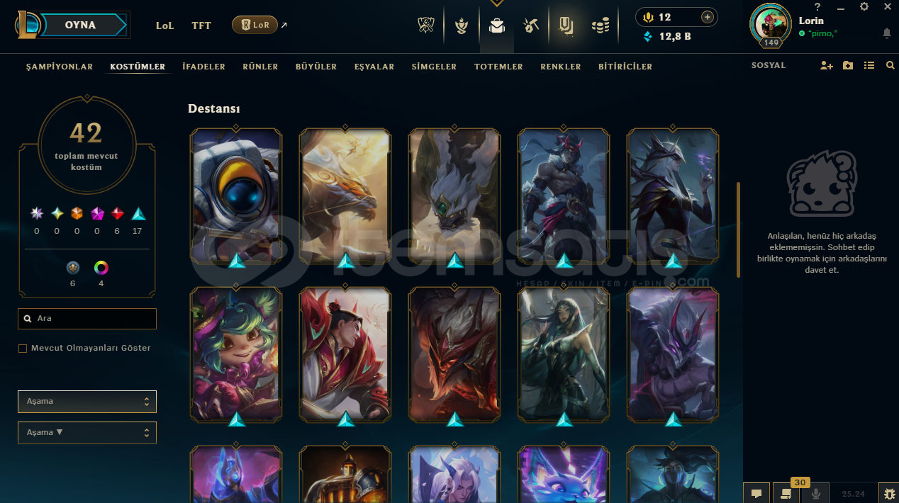 hesapta 110 şampiyon, 42 kostüm, 12,867 mavi öz vardır.