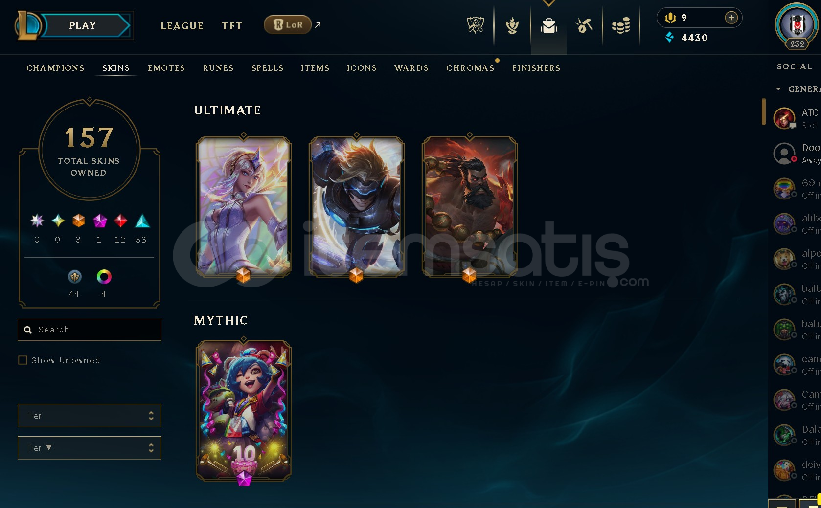 hesap trdir.mail ve şifre değişir.157 kostüm mevcut.rank unrankeddır.kostümlerin detaylı fotoları ilanda mevcuttur,ek bilgi için yazabilirsiniz.