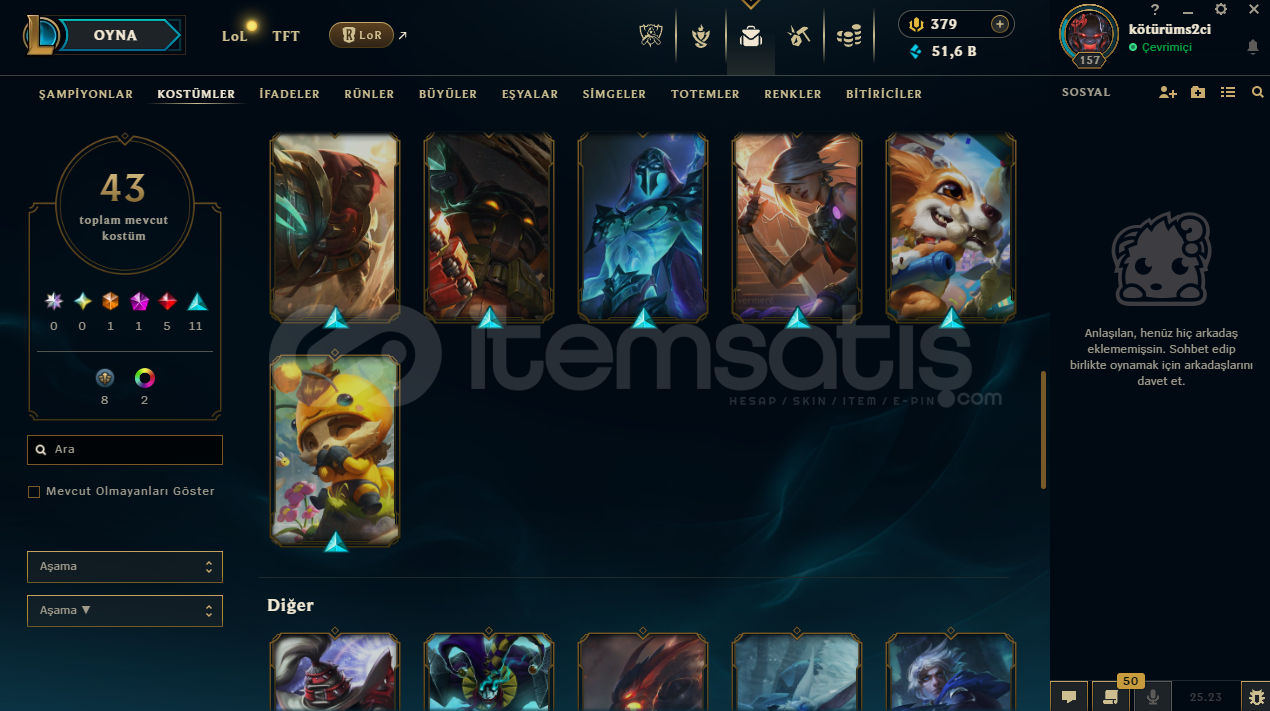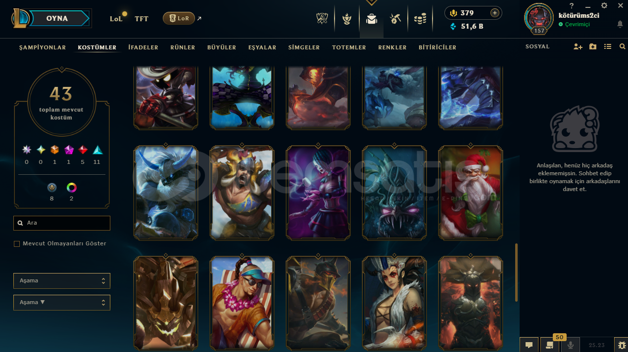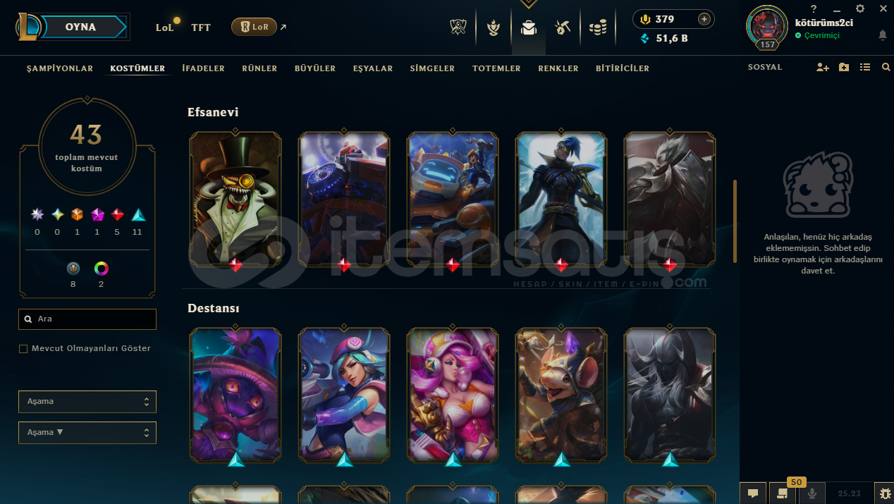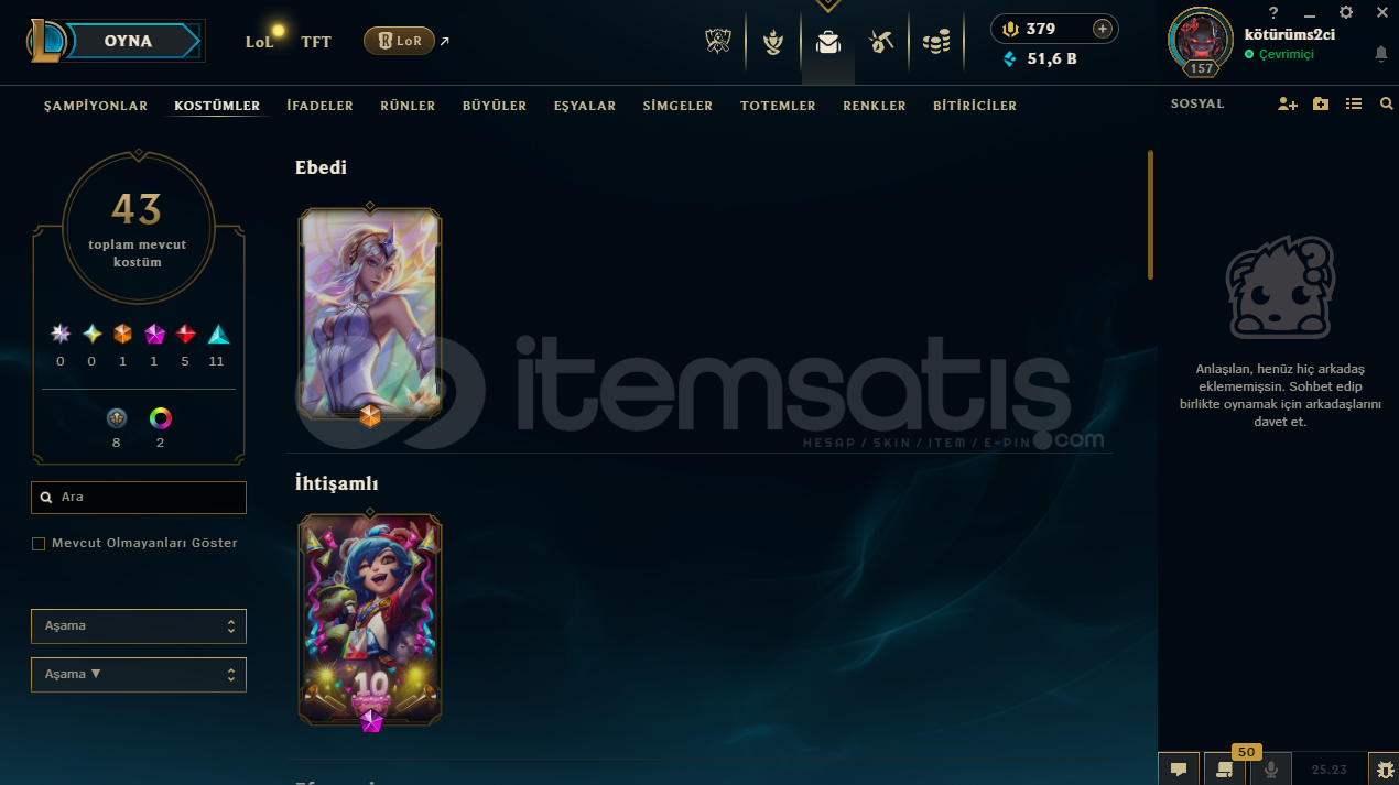 uygun bütçeli lol hesapları için profilime göz atabilirsinizhesap tr hesabıdır.hesabın maili değişmektedir.hesabın herhangi bir banı yoktur.hesap 3 takdir seviyesine sahiptir.hesapta 90 şampiyon, 43 kostüm, 51,639 mavi öz vardır.hesapta 1 ebedi, 1 ihtişamlı, 5 efsanevi, 11 destansı kostüm vardır.ekran kaydı açmayı unutmayınız.