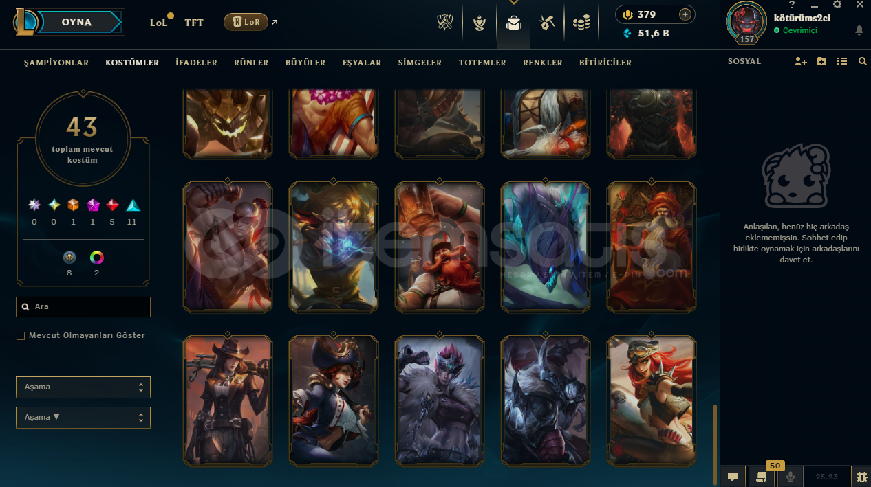 hesapta 90 şampiyon, 43 kostüm, 51,639 mavi öz vardır.