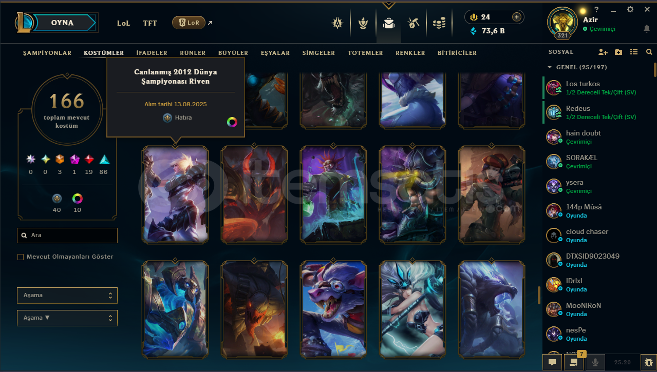 3 Ebedi / 1 İhtişamlı / 19 Efsanevi / 86 Destansı / 40 Hatıra Kostüm 10 Renk paketi İçerisinse 2012 Riven de bulunuyor