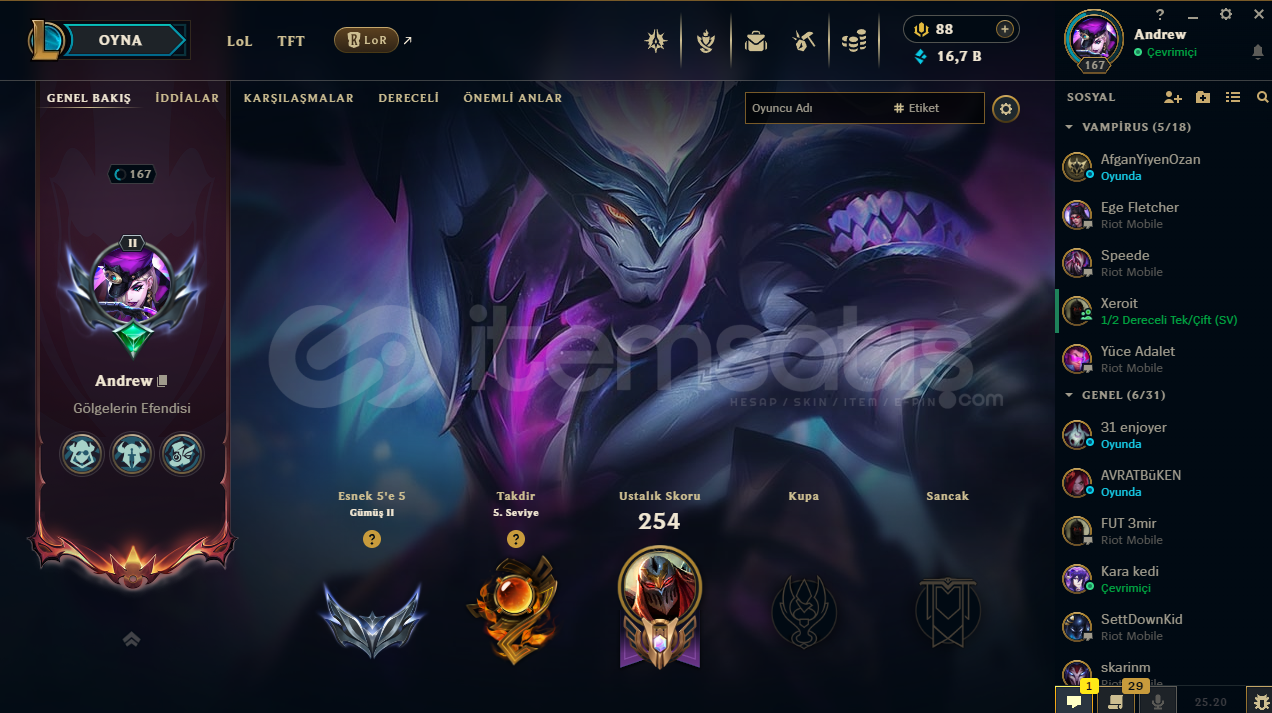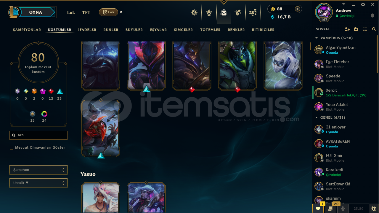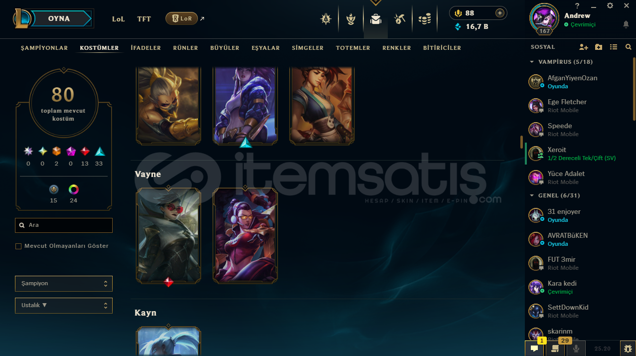 ♡ Abiler Ablalarım Öğrenciyim Maddi Sıkıntıalrdan dolayı hesablarımı satışa koydum rahatlıkla güvenip alabilirsiniz♡ İlan ile sormak istediğiniz birşey varsa yazabilirsiniz♡ Hesabım Emek Verilerek Kasılmıştır .♡ Zed 350K♡80 Seviye Valorant Hesabıda Var İçerisinde .