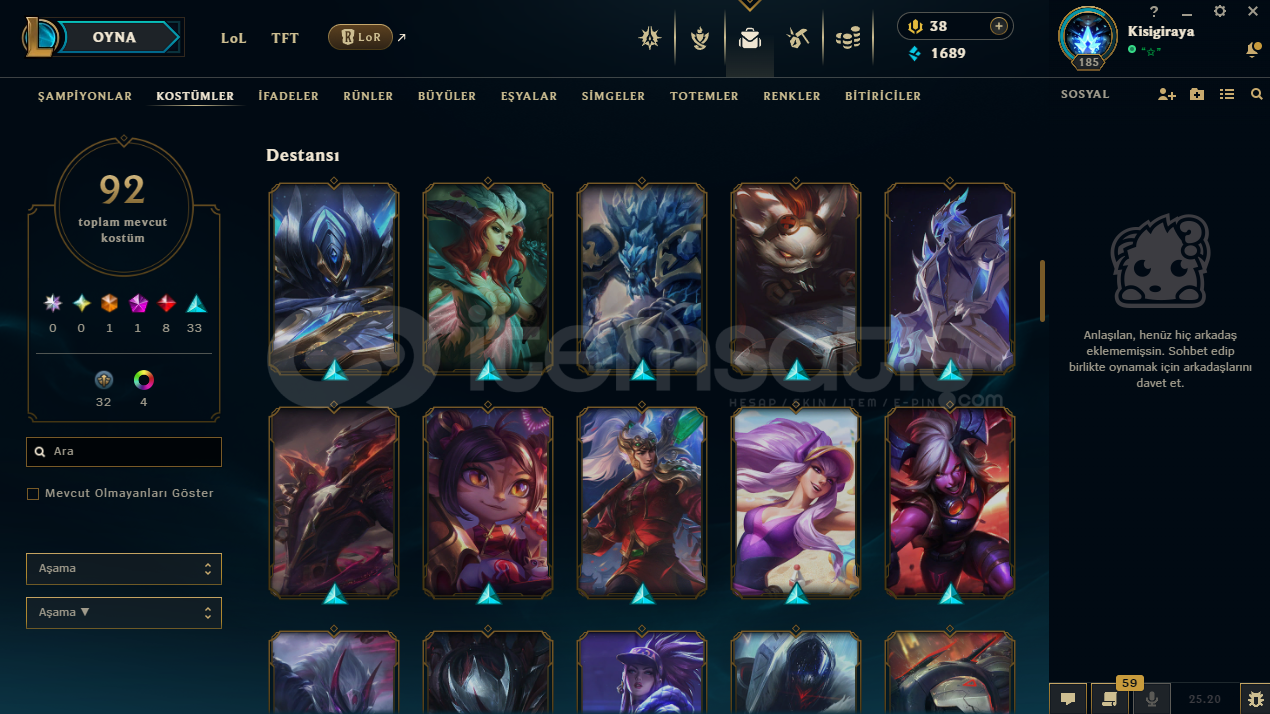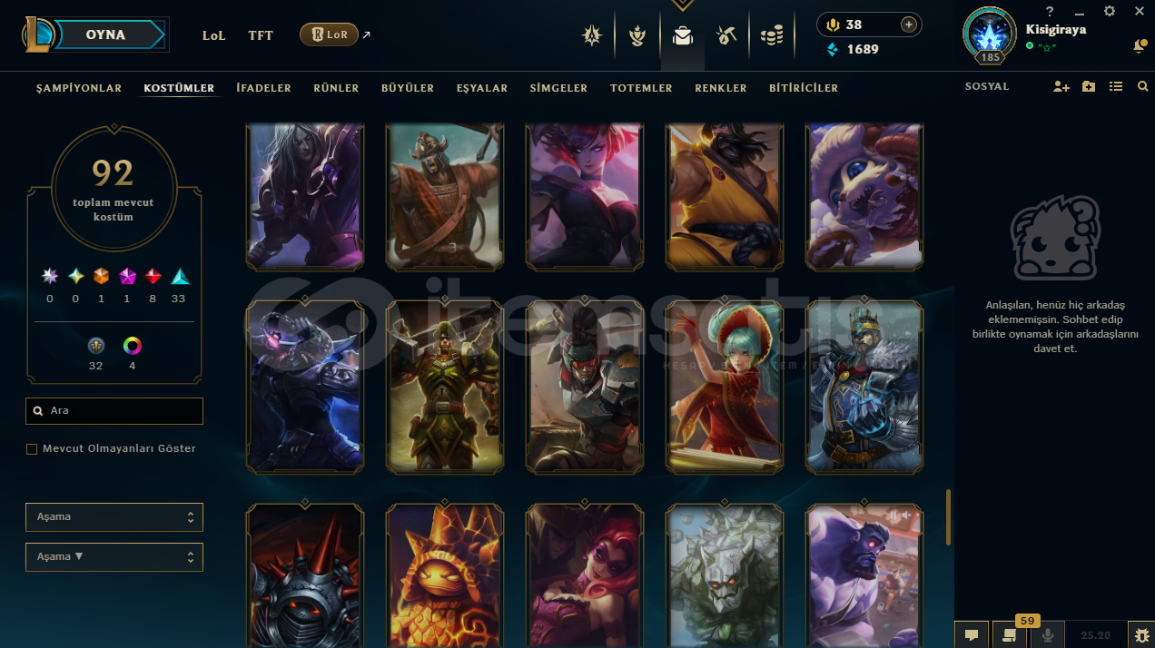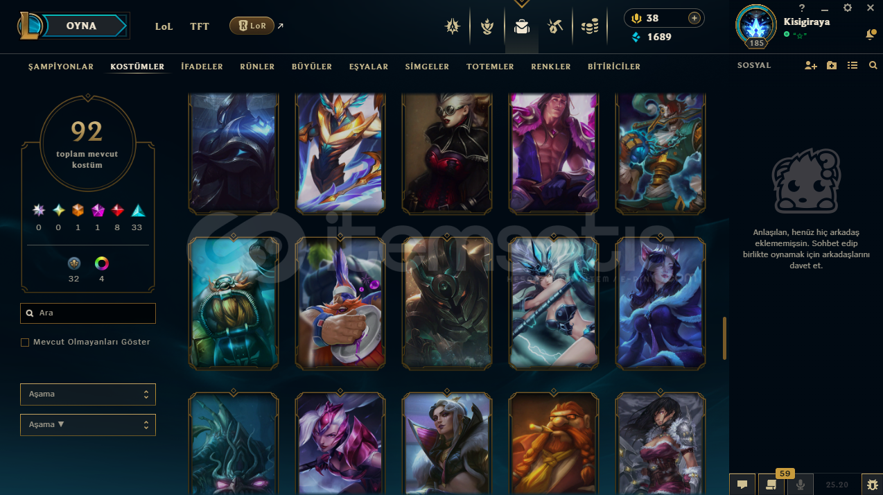 hesapta 121 şampiyon, 92 kostüm, 1689 mavi öz vardır.