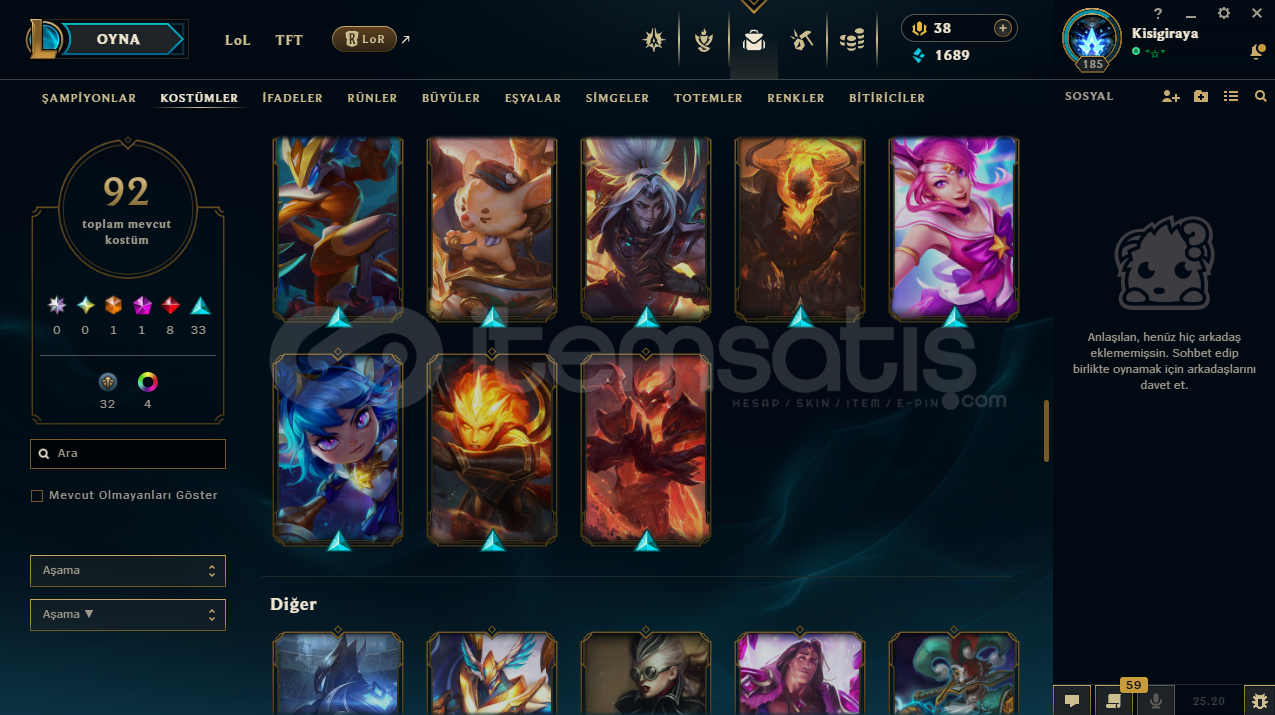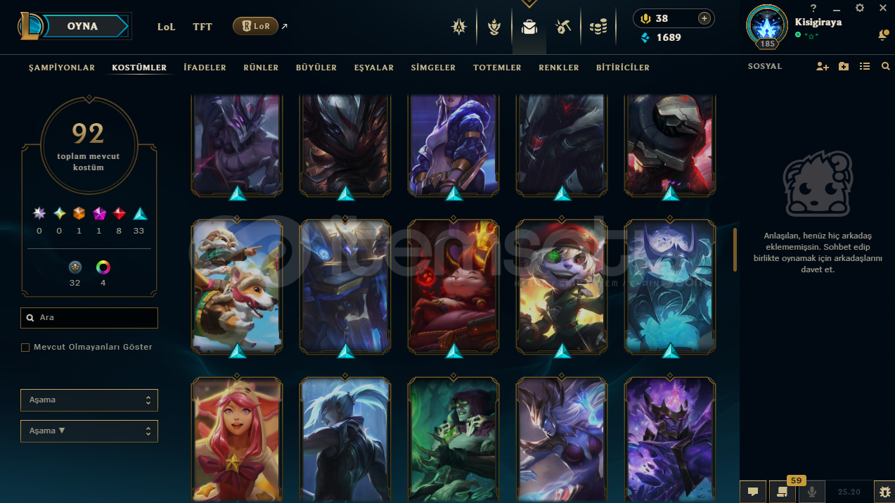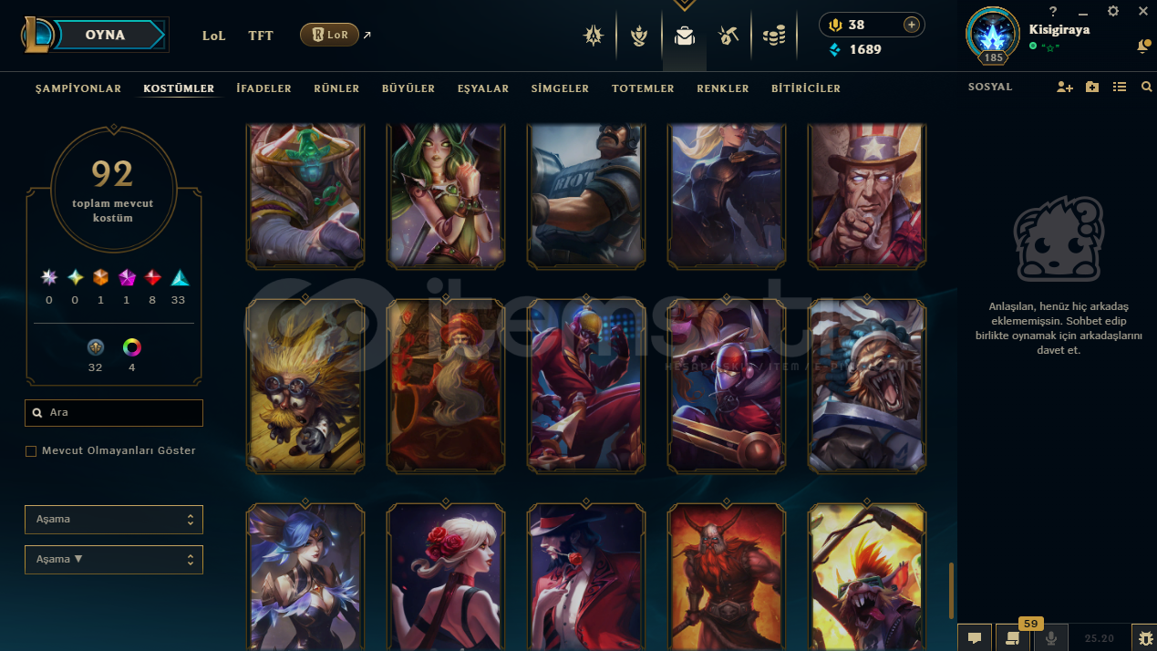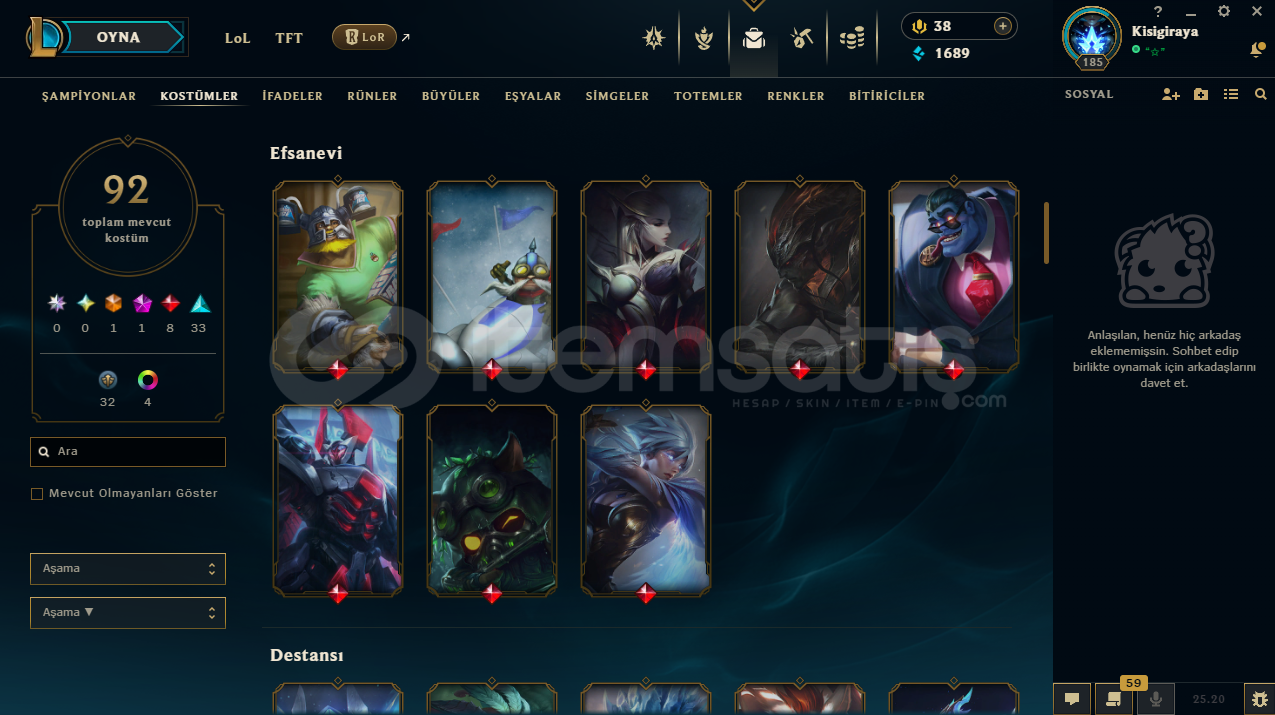 hesapta 121 şampiyon, 92 kostüm, 1689 mavi öz vardır.