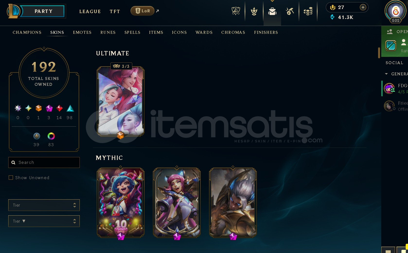 hesap trdir.mail ve şifre değişir.kostümler fotodaki gibidir ek bilgi için özelden yazabılırsınız.90 ihtişamlı öz mevcut.prestij sett,prestij jinx ve anniemo mevcut.win başı 40 lp lose başı 12 13 lp gidiyor.