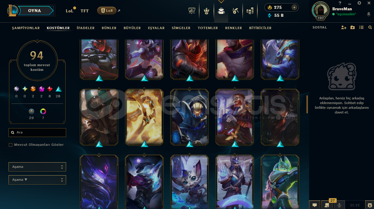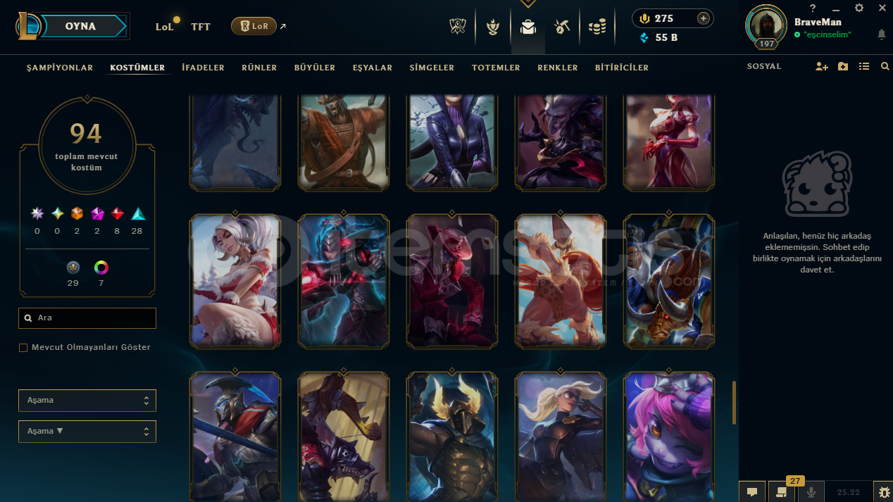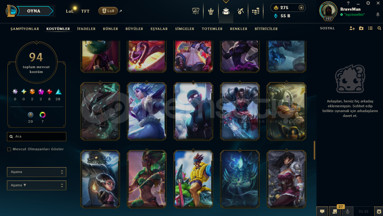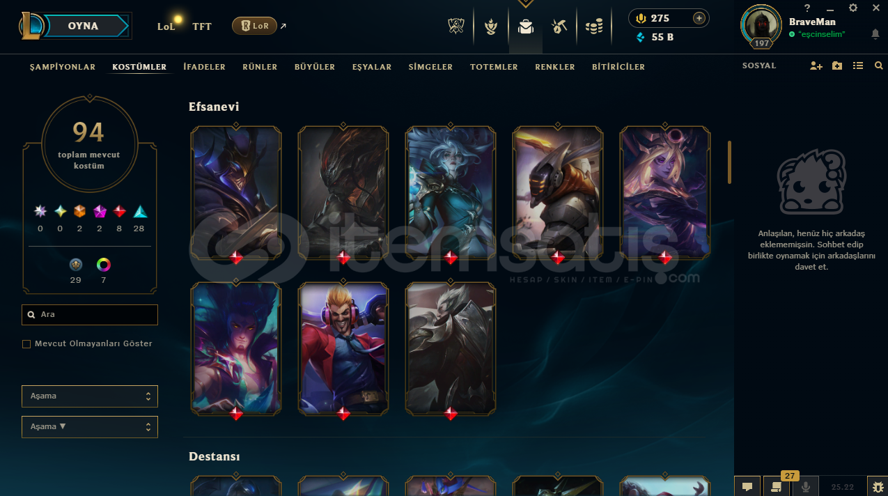 hesapta 146 şampiyon, 94 kostüm, 55,080 mavi öz vardır.