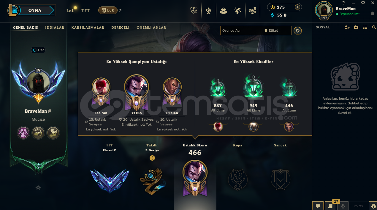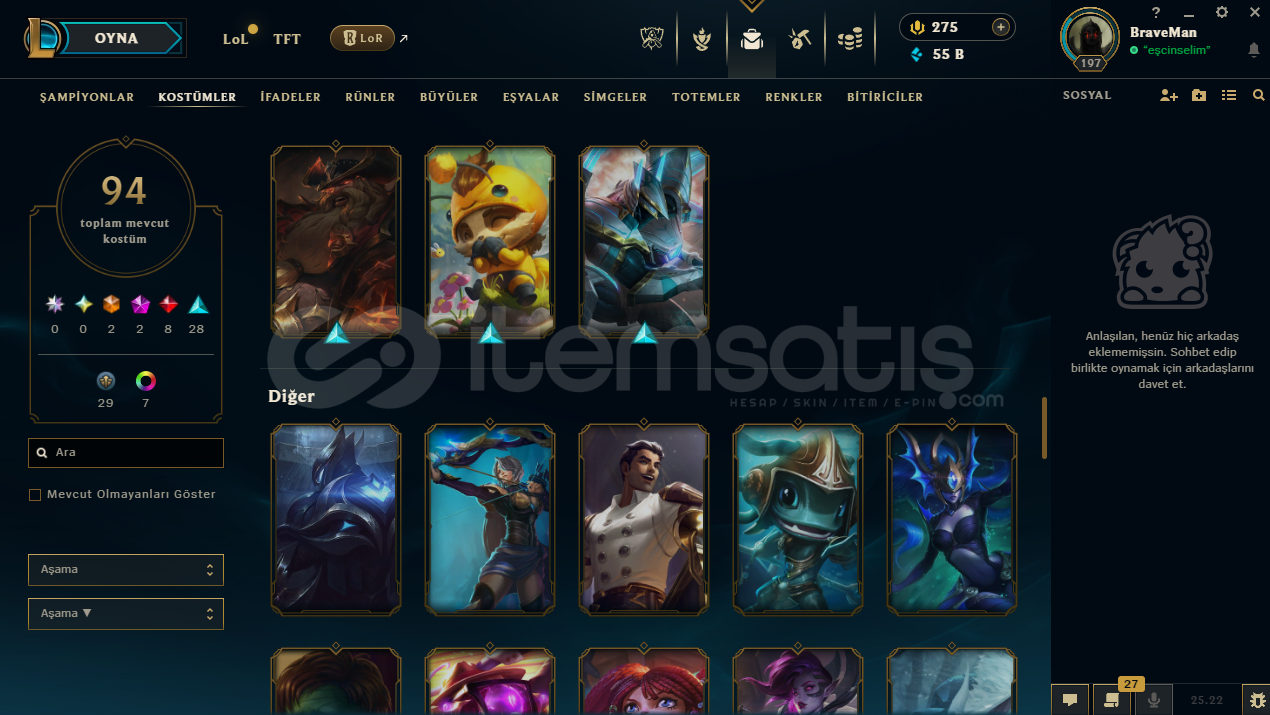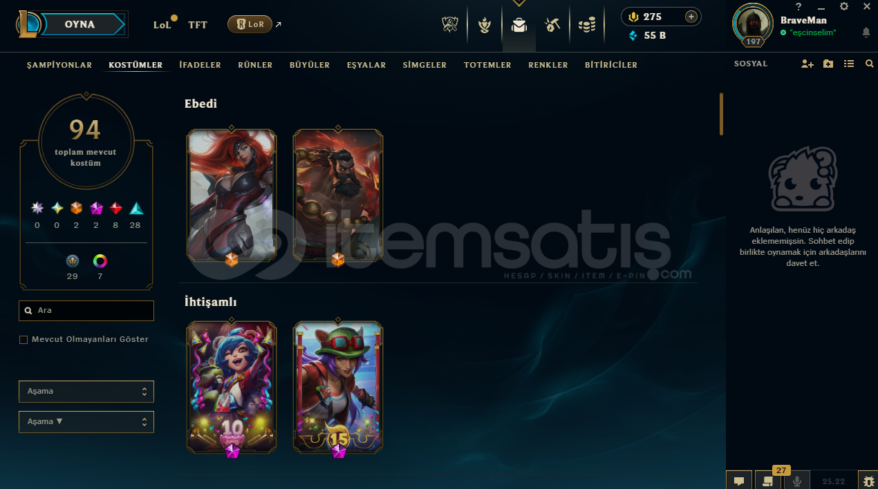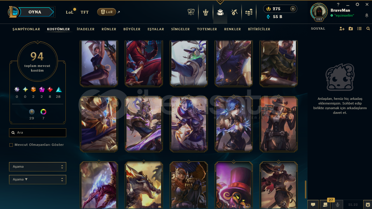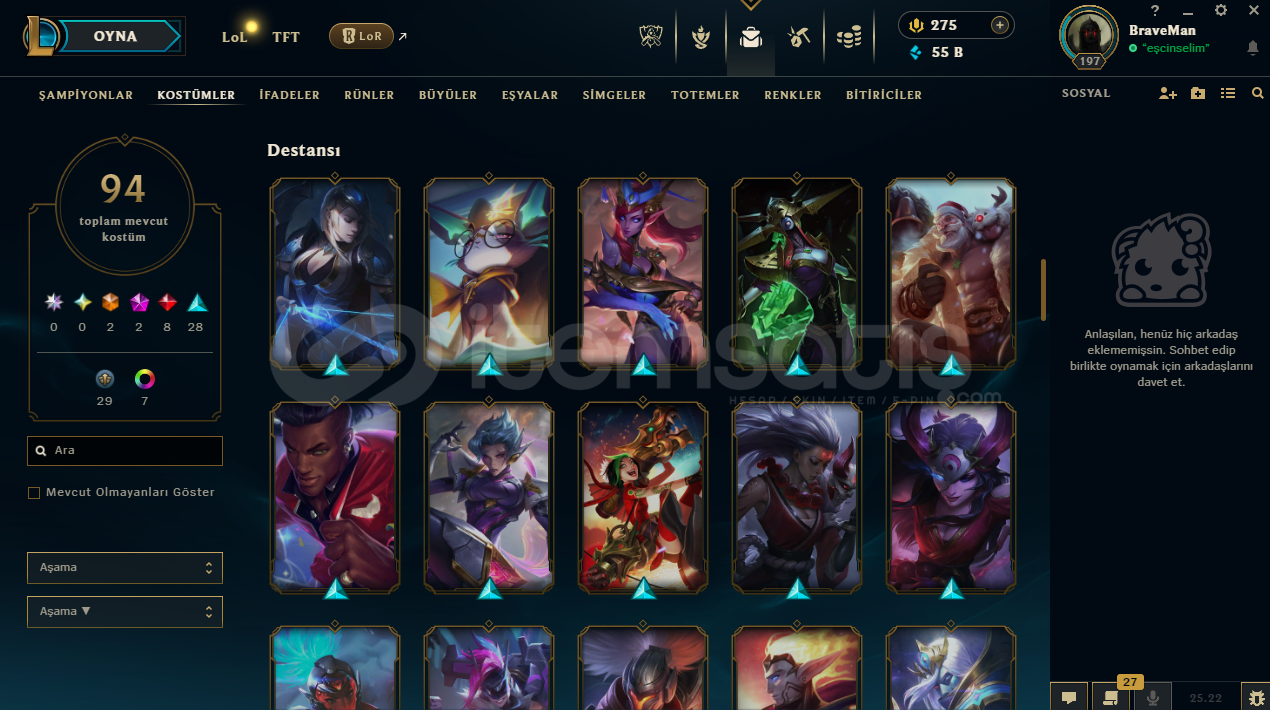 hesapta 146 şampiyon, 94 kostüm, 55,080 mavi öz vardır.