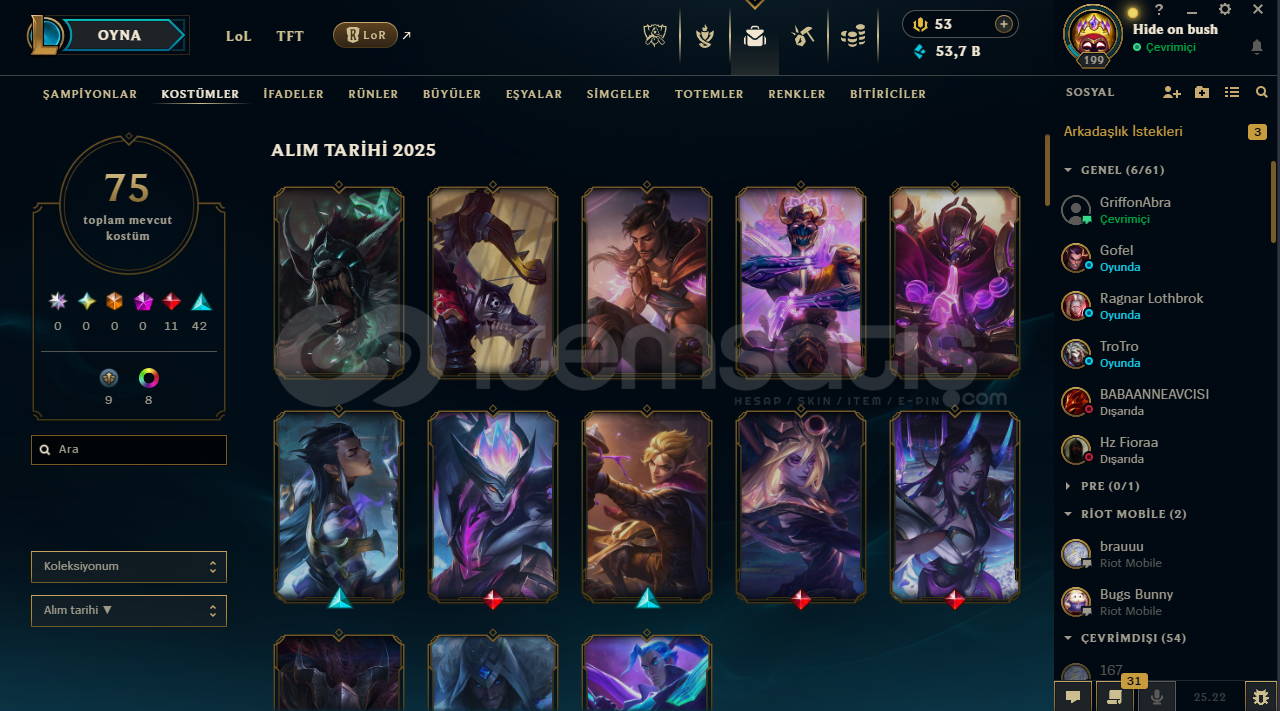 Hesap Hakkında Detaylı Bilgiler: Rank Bronz Toplam 75 Kostüm Vardır +100 Açık Şampiyon Varıdr Mail Değişiyor TR Kurulumludur 199 LeveLdir 53,2B Mavi Öz 53 RP MevcutturBen Aktif Olmasam Bile Hesabın Bilgileri Size İletilirHerhangi Bir Sorunuz Olursa Lütfen Yazmaktan Çekinmeyiniz Not: Hesap Bilgilerinin Yanlış Çıkması Durumunda, İade...