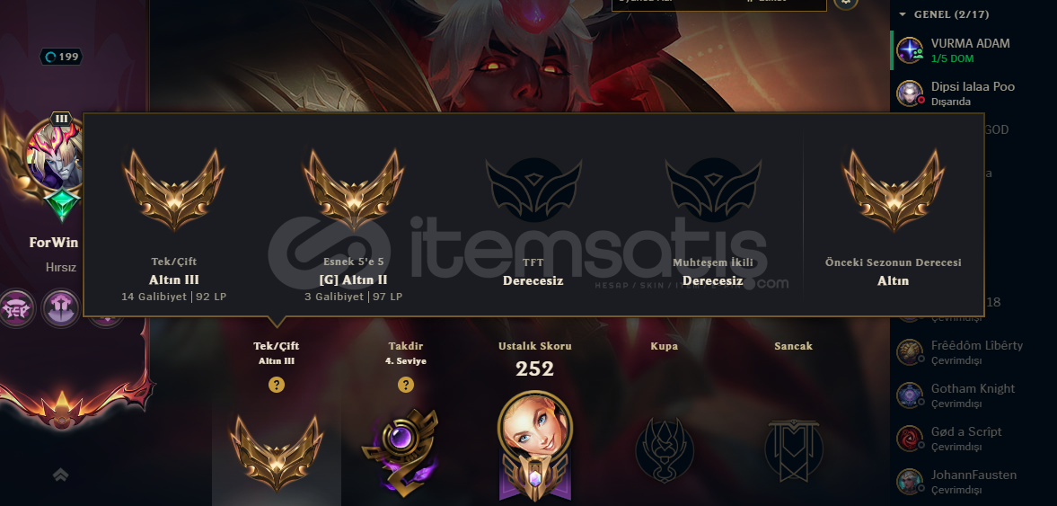 Tek çift altın 3 92 lp Esnek Altın 2 97 LPgeçen sezon altın bitirdi199 seviye11.6k mavi öz58 Rp 140 karakter açık hemen hemen hepsi açık yani74 kostümELEMENTALİST LUXÇelik intikam miss fortunekostümleri var89 ifade açık130 simge açık23 totem açıkeskiganimeti doluçok iyi hesap