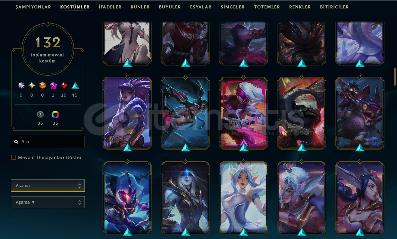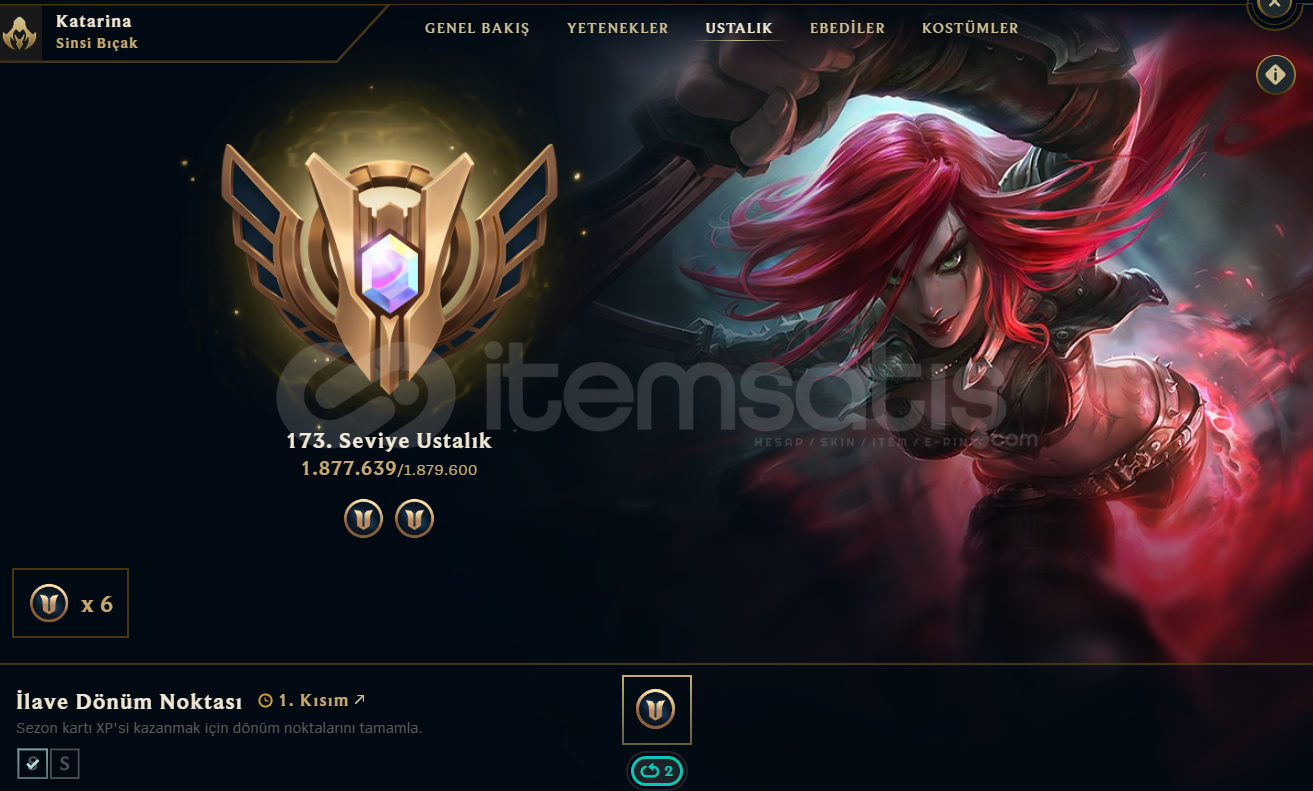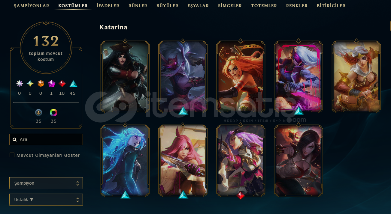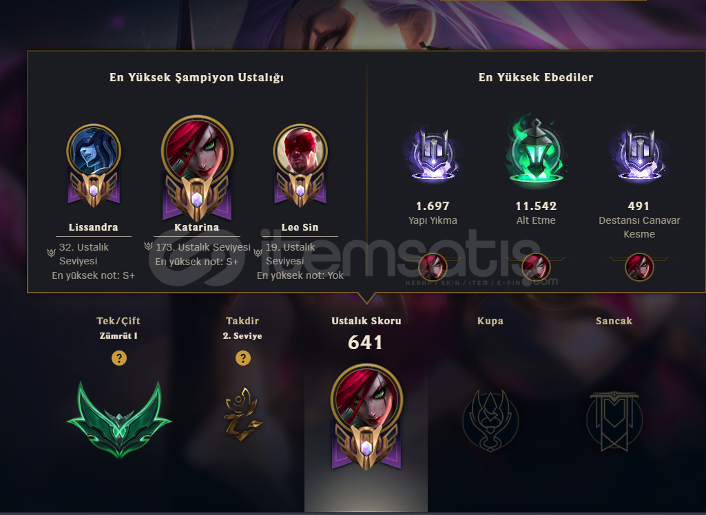Hesap İçeriği170 ŞAMPİYON 132 KOSTÜM 145 İfade237 Simge31 Totem36 Renk Paketi    USTALIKLAR 1.9 MİLYON KATARİNA300 K LİSSANDRA 200 K Lee Sin Hesap fırsat ürünüdür kısa süreliğine bu fiyatta kalacaktır.Diamonddan zümrüte düşmedir, diğer sezonlarda diamond oldu.Görsellerde de gördüğünüz gibidir farkl...