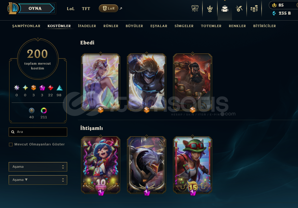 Hesabım 2016den beri el emeğimdir artık oyunu bıraktım ve kendi trdeki ana hesabımdır hiçbir türden ban yemedi her sezon 5 seviye takdirlidir dereceli neredeyse oynanmadı mmr temiz hesaptır ganimette 14bin turuncu öz vardır 25 adet açılmamış kostüm vardır zed otp oldugum için neredeyse tüm kostümler açıktır prestij kod adı zed kostümü dahil 212 adet ...