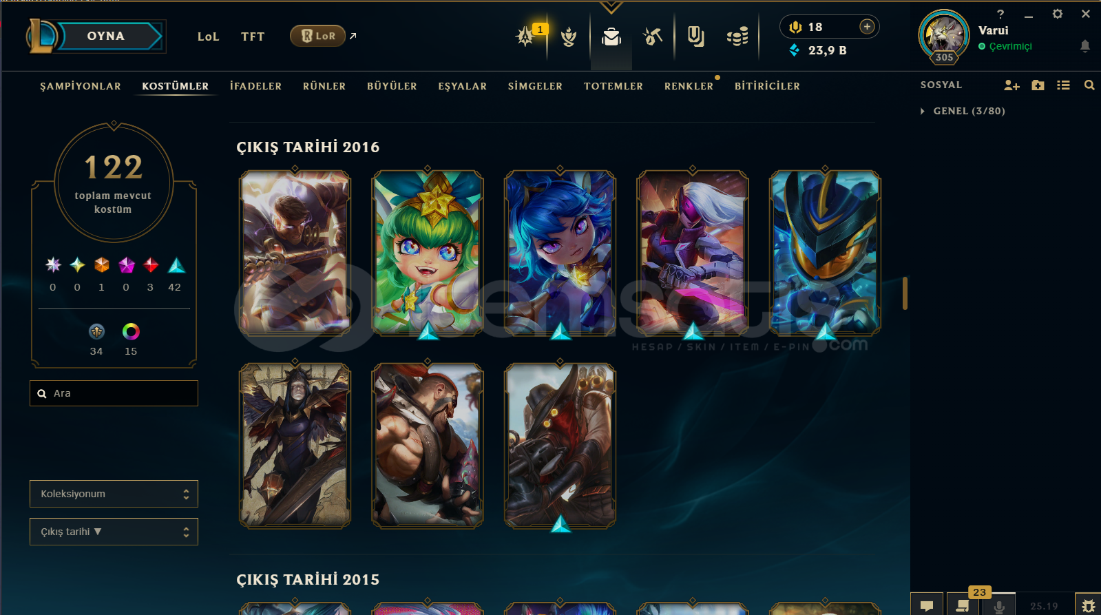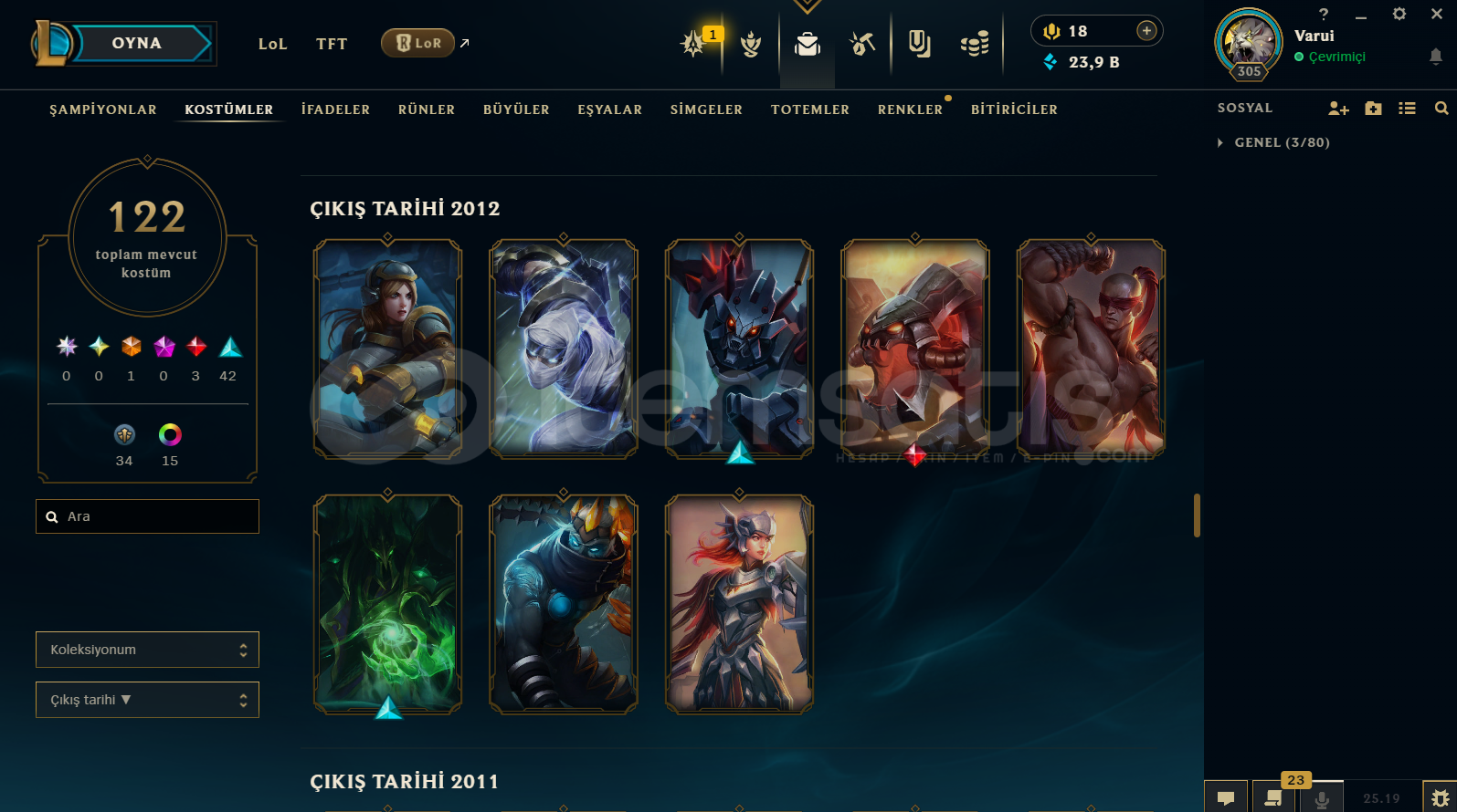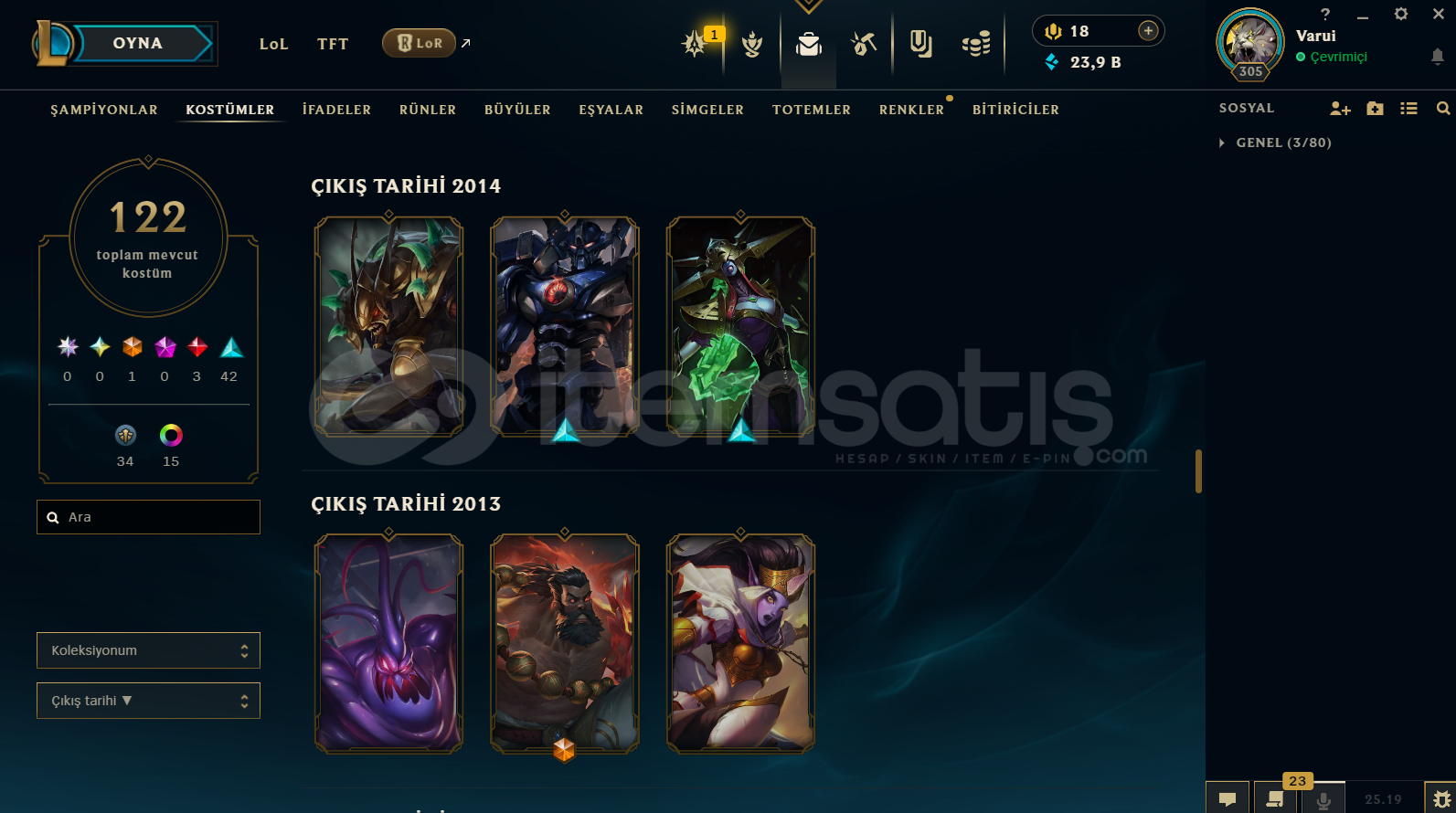 📍 Sunucu: Türkiye 📅 Hesap Yaşı: 11 Yıl (2014’ten beri aktif) 🎮 Seviye: 305 🏆 Rank: Unranked (tüm sezon maçları oynanmamış, tertemiz MMR) 💥 Şampiyonlar: Tüm şampiyonlar açık (Full Hero) 🎨 Kostümler: 122 adet (1 Ebedi, 3 Efsanevi, 42 Destansı, 34 Hatıra, 15 Renk) ✨ Simge/İfade: 238 simge + 133 ifade🧩 Öne Çıkan Nadir Kost...