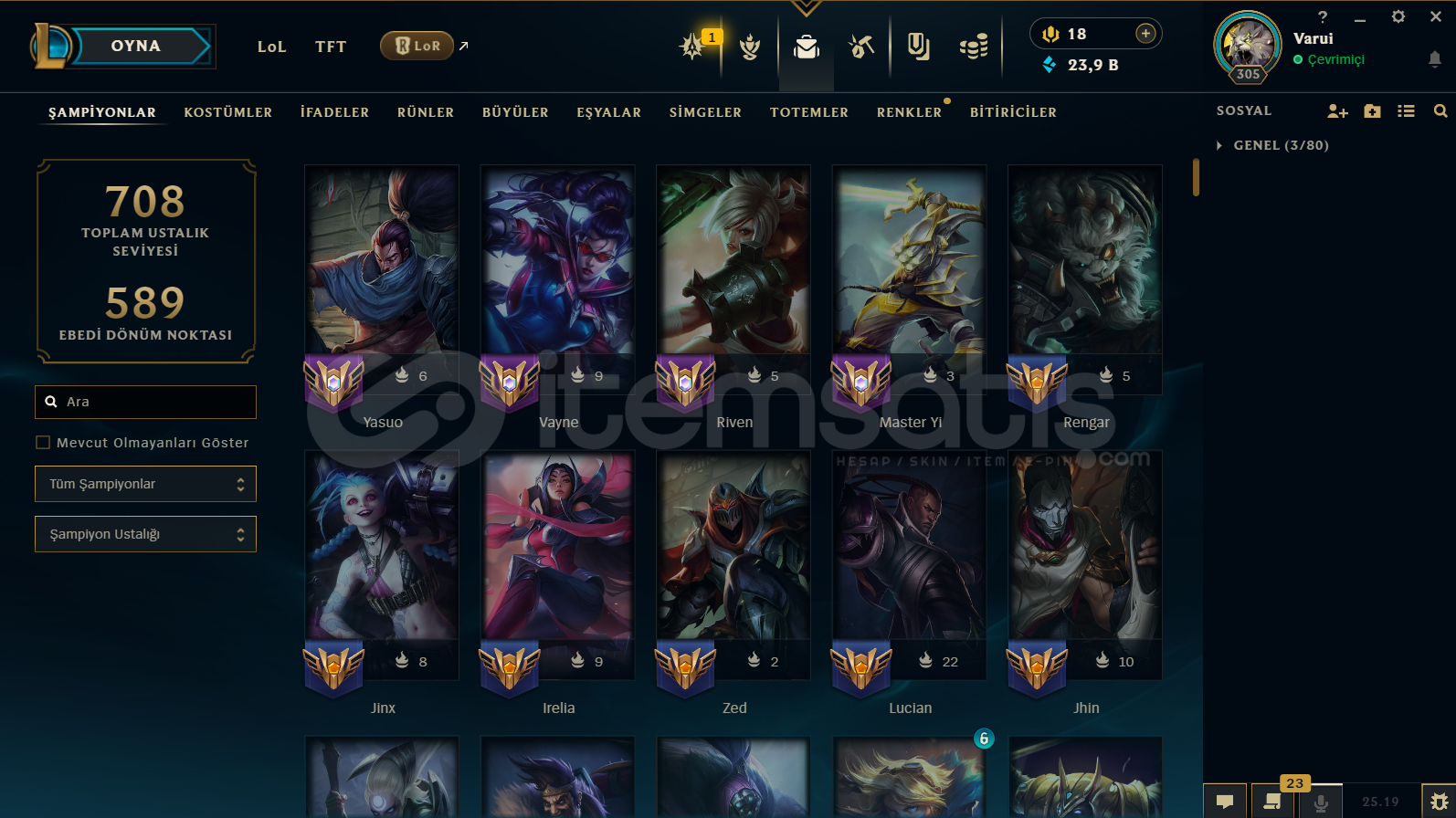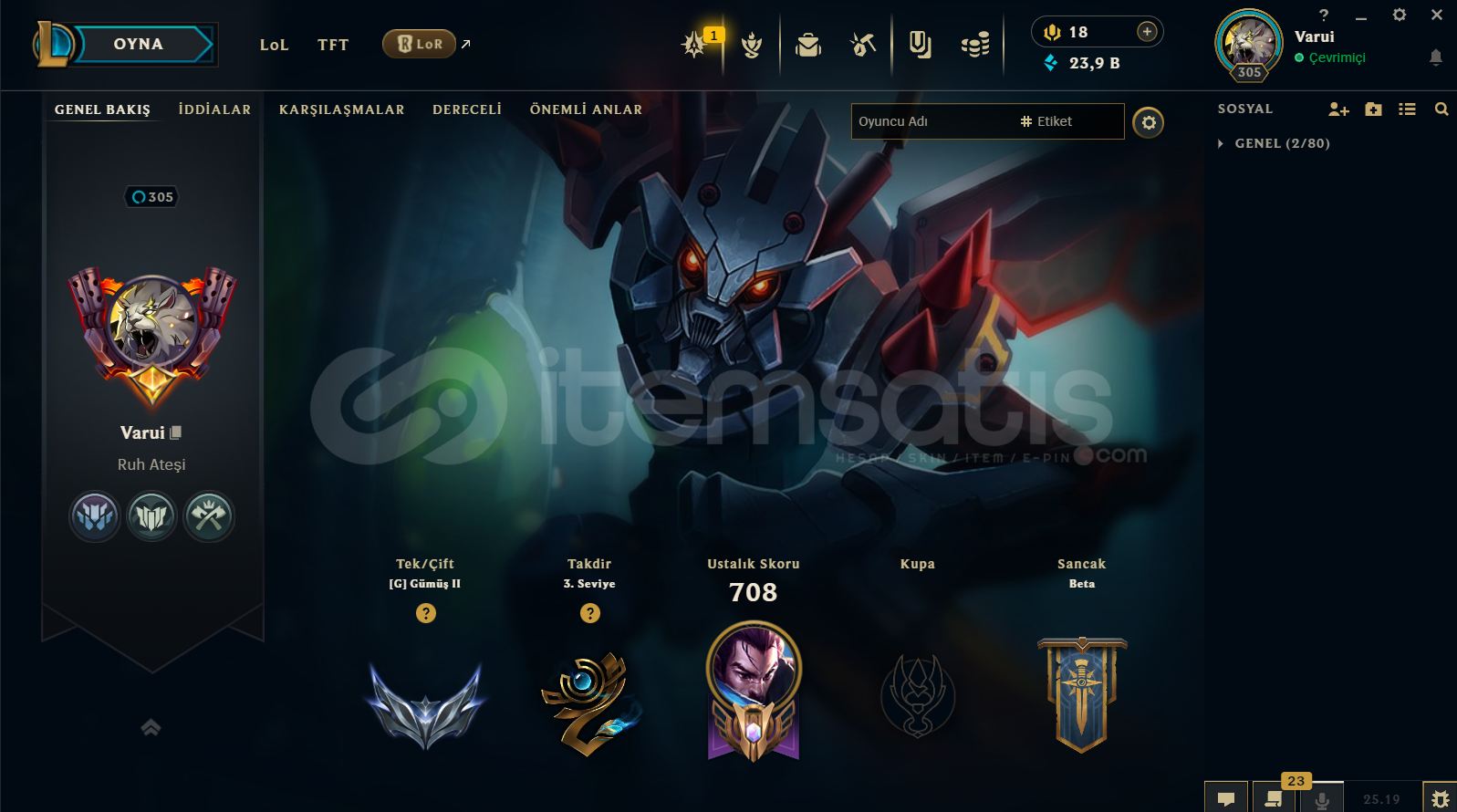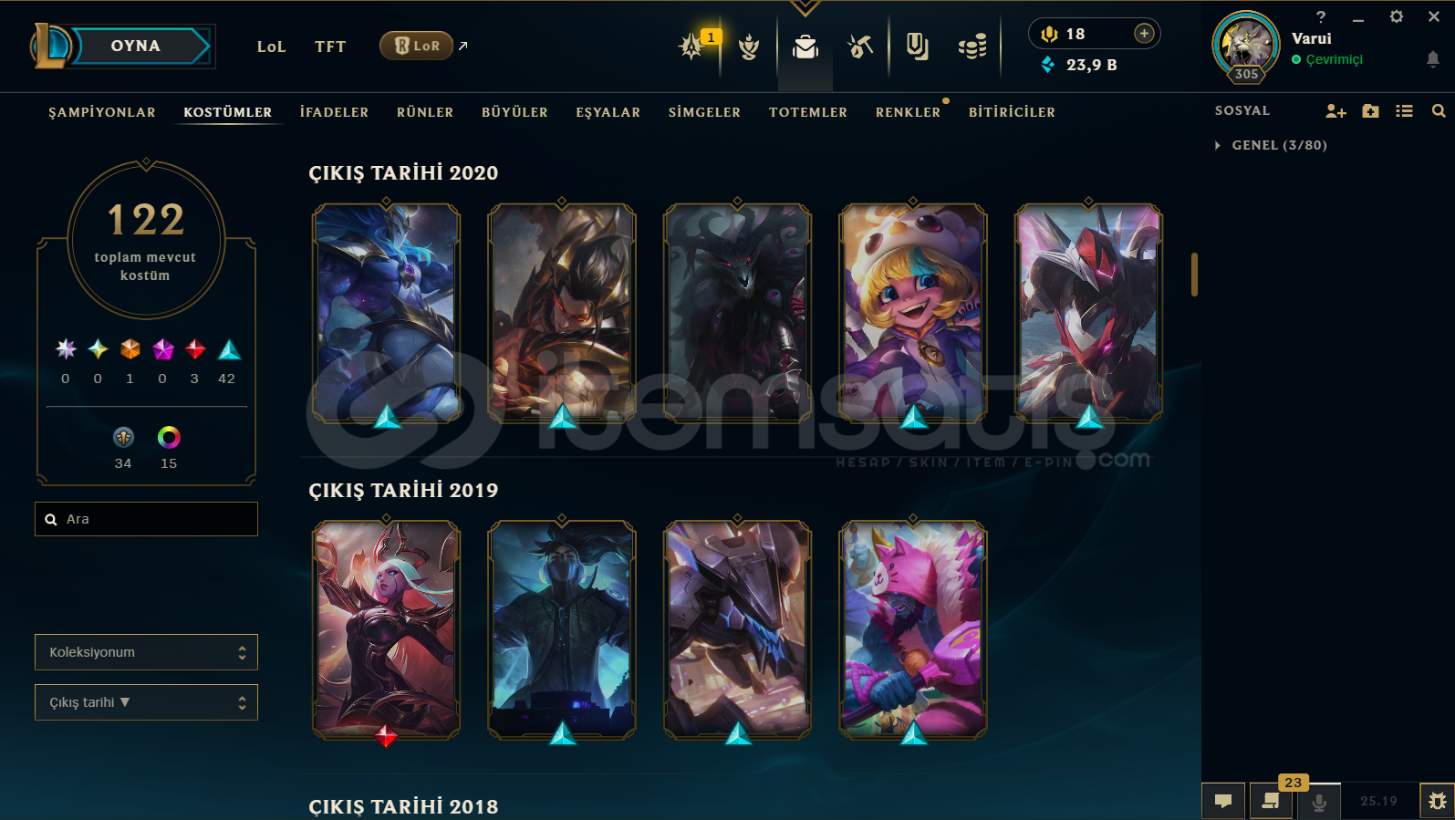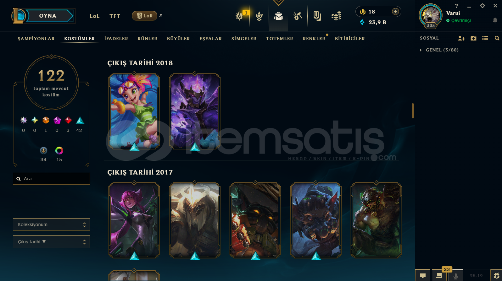 📍 Sunucu: Türkiye 📅 Hesap Yaşı: 11 Yıl (2014’ten beri aktif) 🎮 Seviye: 305 🏆 Rank: Unranked (tüm sezon maçları oynanmamış, tertemiz MMR) 💥 Şampiyonlar: Tüm şampiyonlar açık (Full Hero) 🎨 Kostümler: 122 adet (1 Ebedi, 3 Efsanevi, 42 Destansı, 34 Hatıra, 15 Renk) ✨ Simge/İfade: 238 simge + 133 ifade🧩 Öne Çıkan Nadir Kost...