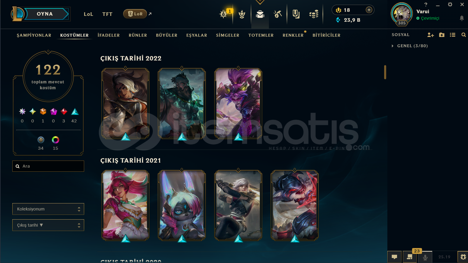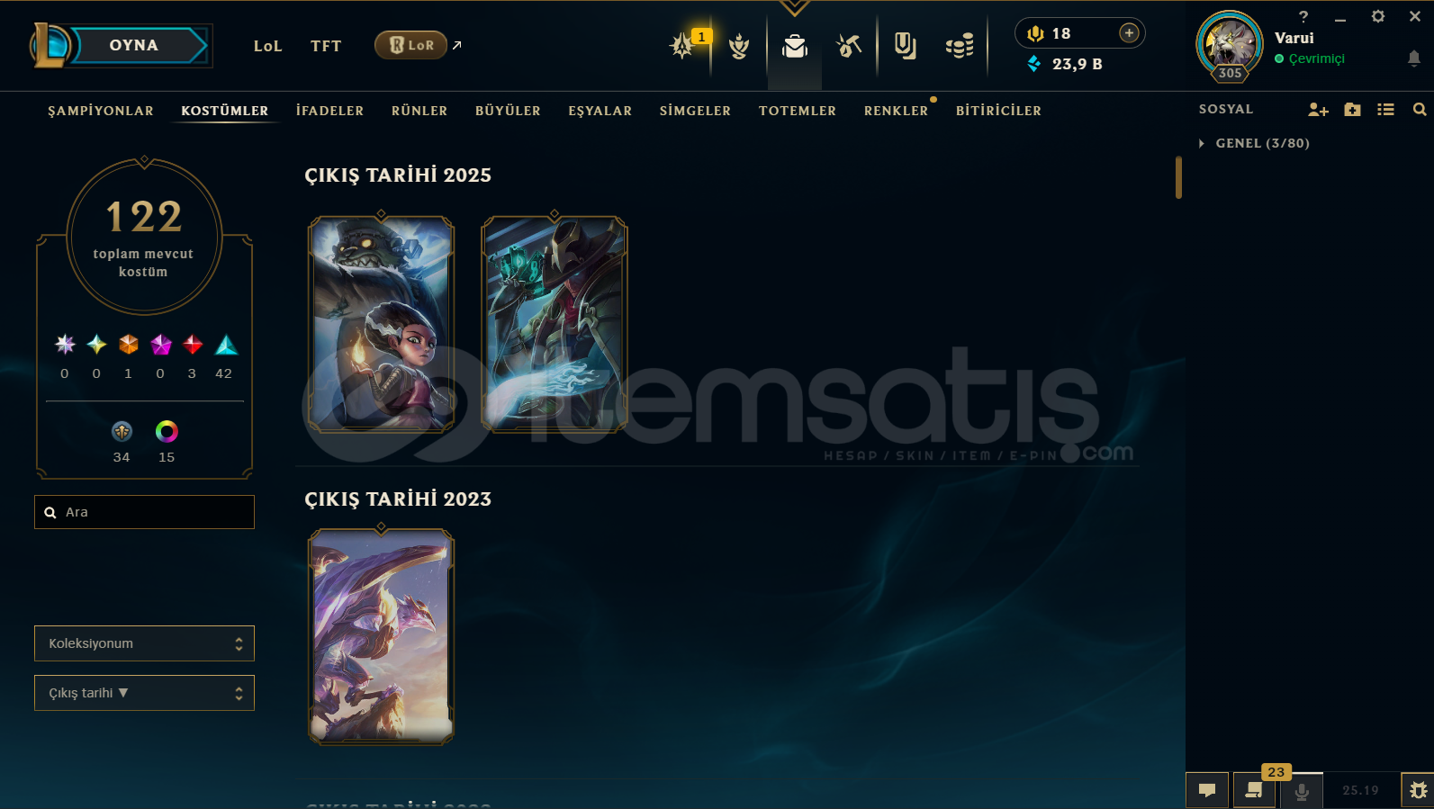 🎨 Kostümler: 122 adet (1 Ebedi, 3 Efsanevi, 42 Destansı, 34 Hatıra, 15 Renk)