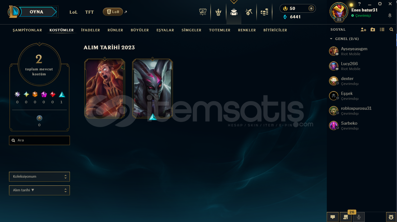 Hesapta 2 adet kostüm bulunmaktadır.6000 MÖ - 50RP - 849TÖ - 2 Hextec Sandığı - 1 Hextec Anahtarı - 1 Temel Şampiyon Kapsülü Bulunmaktadır Bu Detayı Çoğu Satıcı Vermez!Hesap teslimi sonrası tüm sorumluluk yeni sahibinde olmaktadır.%100 TR Mail Değişen Hesap