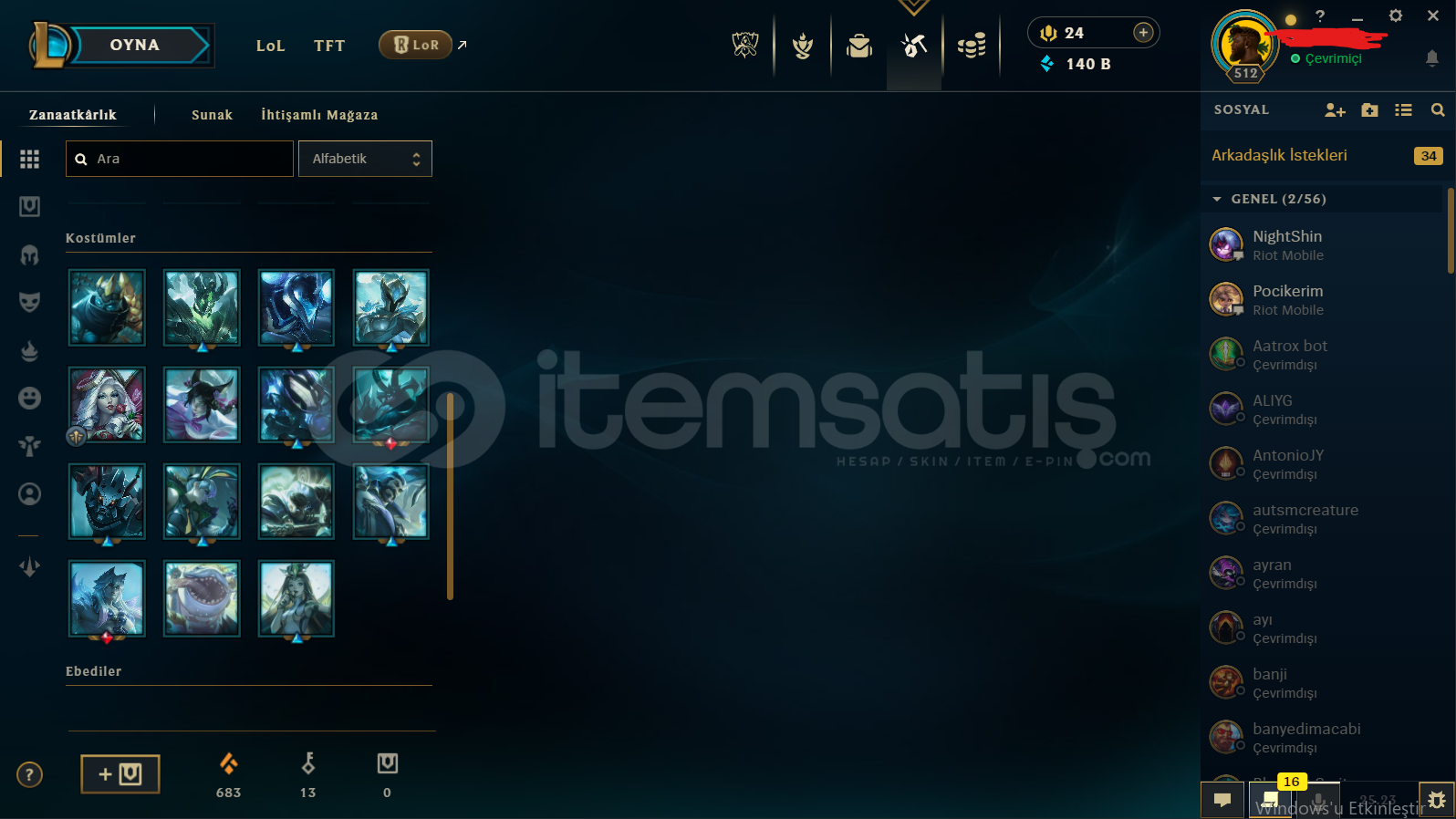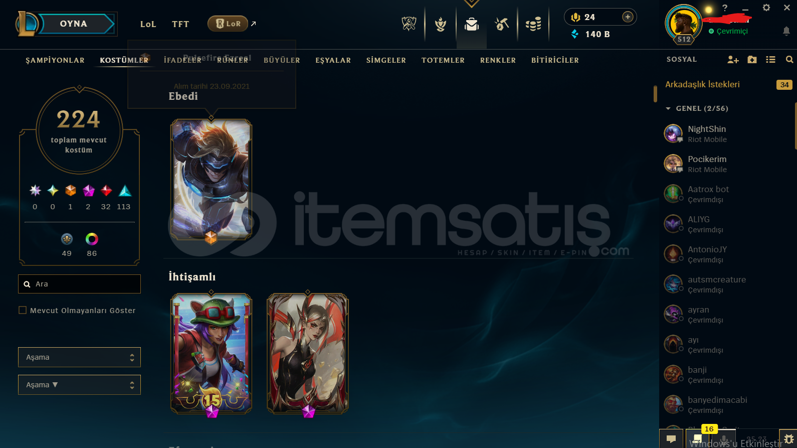 Rank : Zümrüt 4 Esnek Rank : Platin 2512 Level 1 ebedi 2 ihtişamlı 33 tane efsanevi 113 destansı 49 hatıra skin232 simge mevcuttur Oynamaya Zamanım Olmadığı İçin Satıyorum 140 bin Mavi Öz mevcuttur Epostasıyla Beraber Verilicektir İlk e postası ile